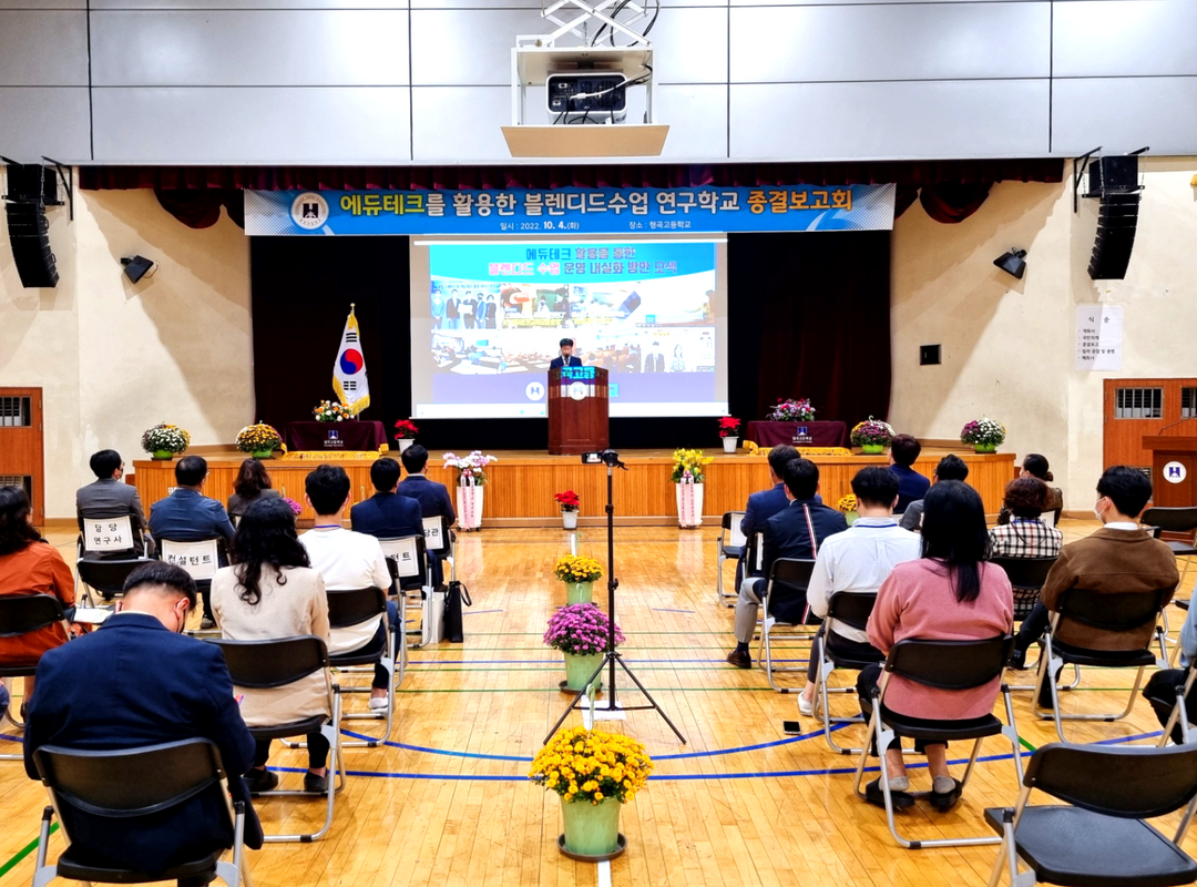 □ 구미 형곡고등학교(교장 서충교)는 10월 4일(화), 11시 30분부터 16시 30분까지‘에듀테크를 활용한 블렌디드 수업 운영 방안 모색’을 주제로 연구학교 종결보고회를 실시하였다.