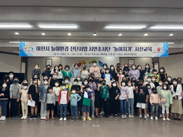 이번 사전교육에는 100명의 시민조사단과 김경희 이천시장, 세이브더칠드런 중부2지역본부 조규민 센터장이 참석해 놀이지기에 대한 위촉장 수여, 아동권리교육, 놀이환경진단 시민조사단 실무 교육 등이 진행됐다.