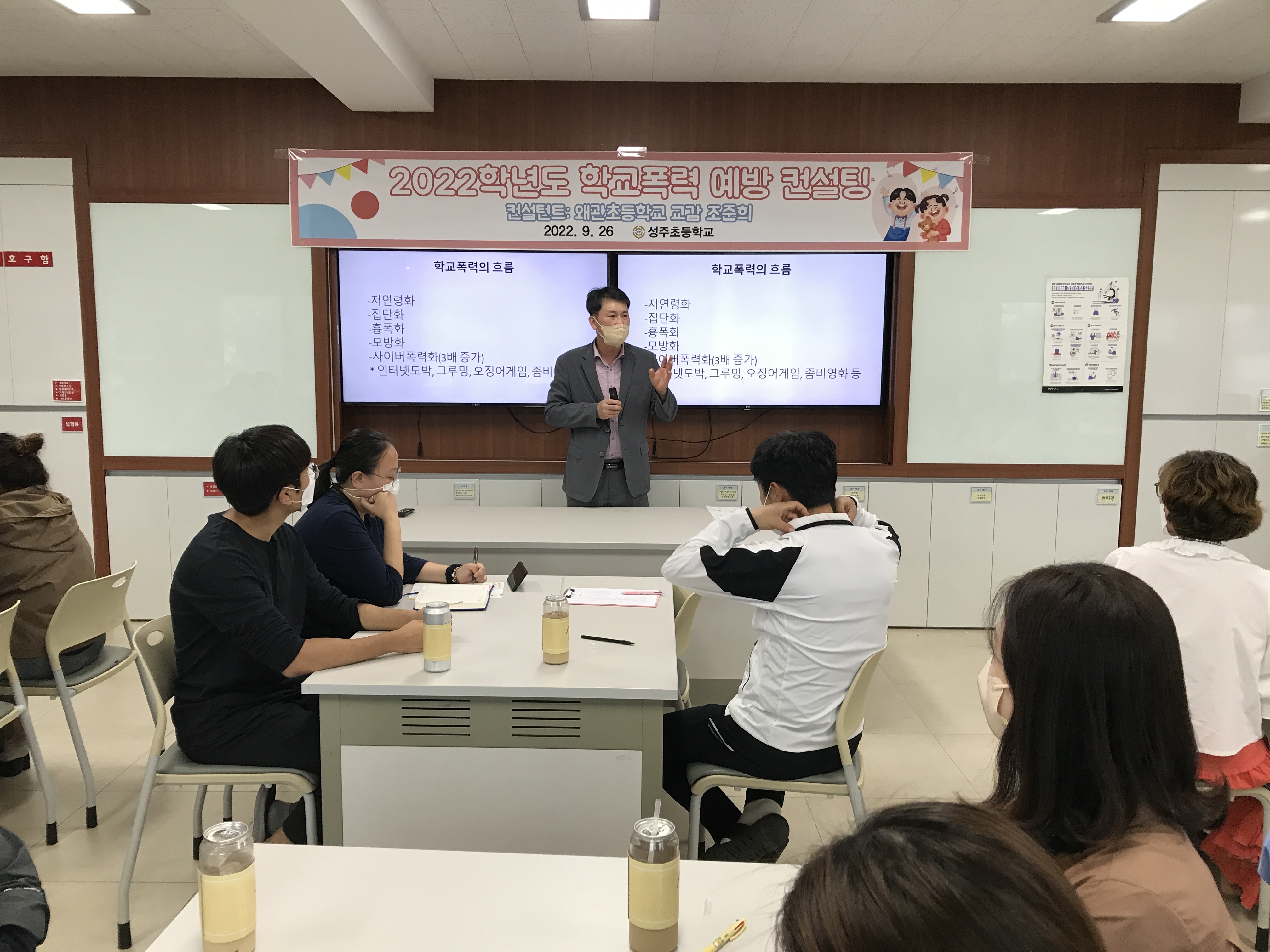 □ 성주초등학교(교장 조재국)는 2022년 9월 26일(월) 오후 3시 전 교원을 대상으로 학교폭력 예방을 위한 컨설팅을 실시하였다.