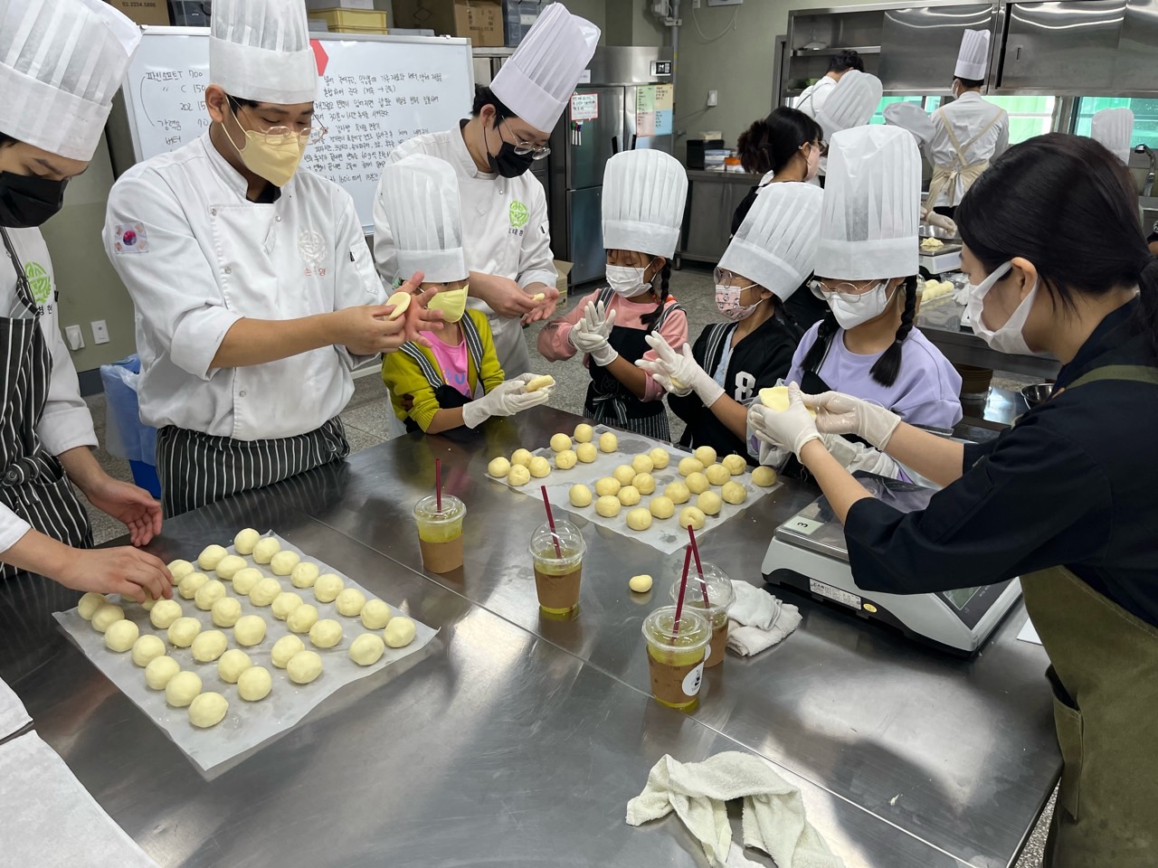□ 이 날 실습 품목으로는 감자빵을 진행하였다. 학생들이 직접 체험 할 수 있는 과정을 진행하다 보니, 실습실에서 일어날 수 있는 안전사고 상황에 대하여 예를 들어 설명하며 안전교육도 함께 진행하였다.