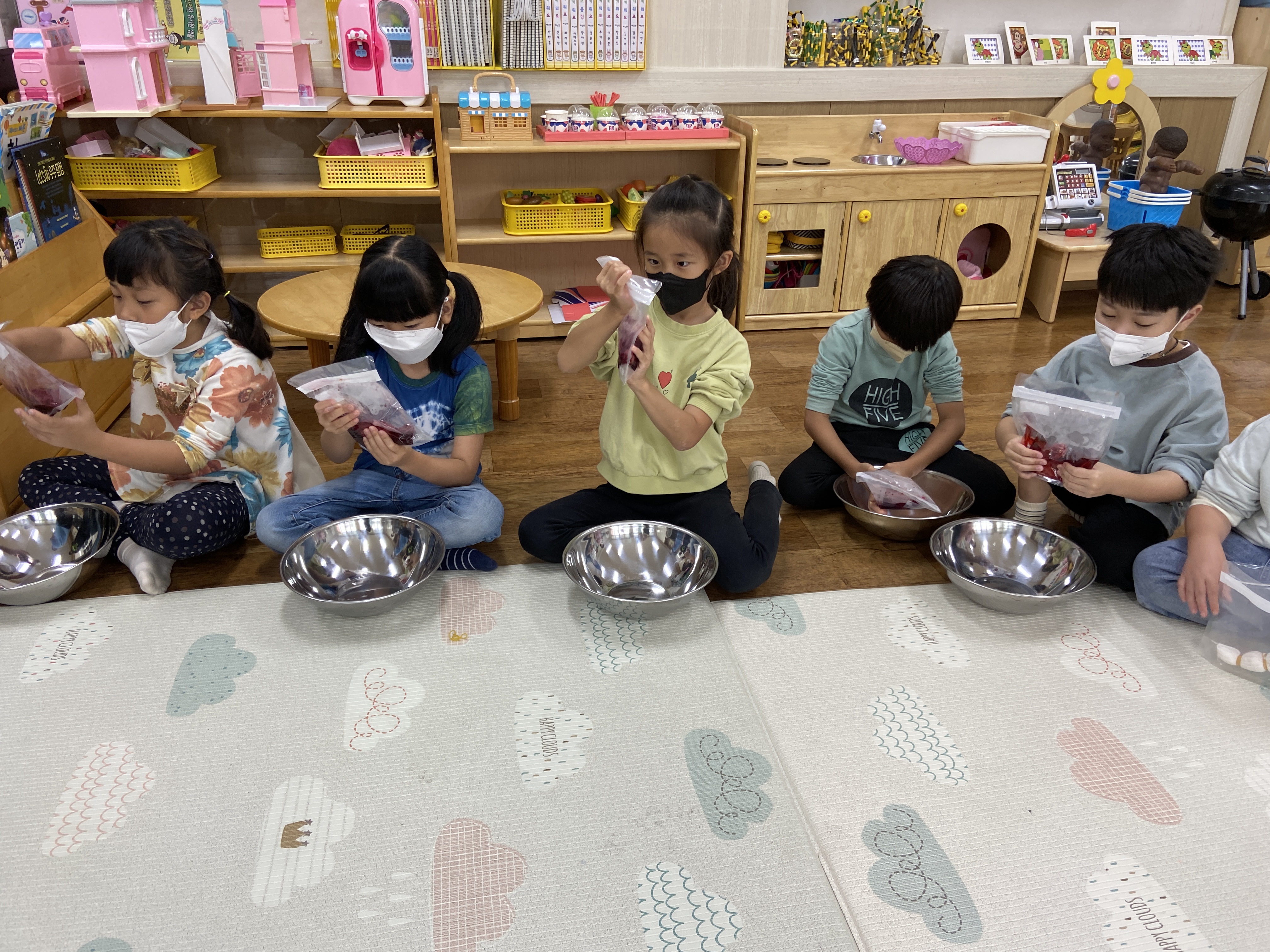 □ 무늬를 만들기 위해 흰색 손수건을 마음대로 접고, 고무줄로 꽁꽁 묶어 준 후 붉은 색 염료와 손수건을 봉지에 담은 후 조물조물 꼼꼼히 주물러 주면 된다. 20분 동안 손수건을 정성들여 주물러준 유아들은 고무줄을 풀고 손수건을 직접 물에 헹구어주며 나만의 손수건을 완성했다.