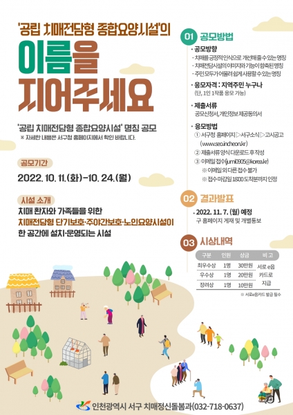 [금요저널] 인천 서구가 오는 11일부터 2주간 원창동 514번지 일원에 건립 예정인 공립 치매전담형 종합요양시설 명칭을 공모한다고 밝혔다.