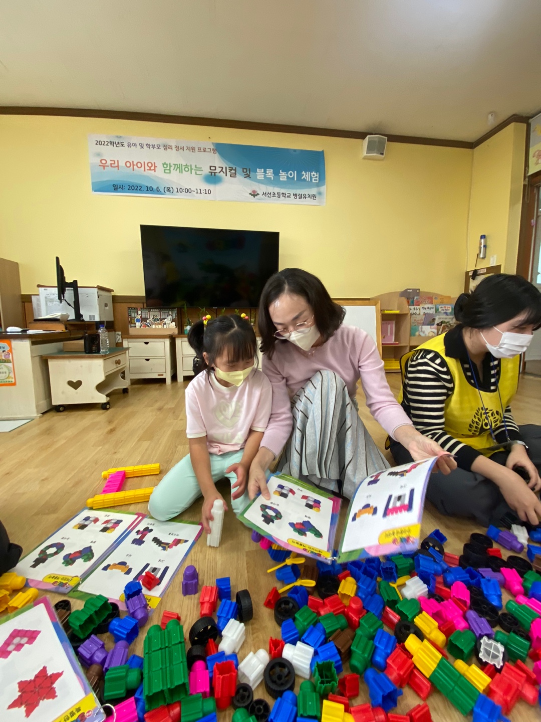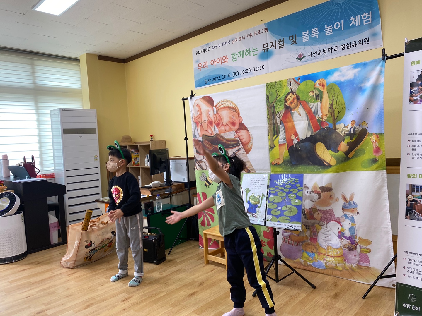 □ 서선초등학교병설유치원(원장 박현숙)은 유아와 학부모를 대상으로 10월 6일(목) 2022학년도 유아 및 학부모 심리정서지원 프로그램 운영으로 ‘우리 아이와 함께하는 행복감 증진 뮤지컬 및 블록놀이 체험’을 실시하였다.