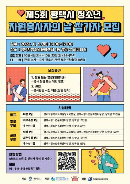 제5회 평택시 청소년 자원봉사자의 날은 평택시청소년문화센터 자원봉사단TV 주관, 경기도평택교육지원청 협력으로 진행한다.