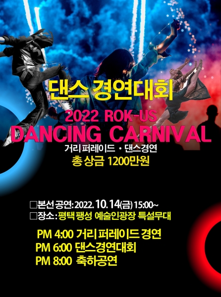14일 오후 4시부터 평택시 팽성 예술인광장 특설무대에서 화려하게 펼쳐질 ‘2022 한미댄싱카니발’은 거리 퍼레이드, 댄스 경연대회, 축하공연 등으로 3천여명의 관중들을 매료시킬 것으로 예상된다.
