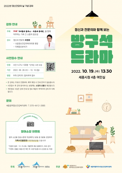 [금요저널] 세종특별자치시광역정신건강복지센터와 세종특별자치시정신건강복지센터가 공동으로 오는 19일 오후 1시 30분 시청 여민실에서 ‘정신건강의 날’을 기념해 정신건강 시민강좌 ‘정신과 전문의와 함께 보는 방구석 드라마’를 진행한다.