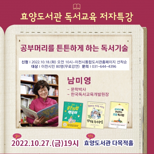 [금요저널] 이천시립효양도서관은 오는 27일 저녁 7시에 어린이독서프로젝트 연계 강연으로 남미영 한국독서교육개발원장을 초청해 “공부머리를 튼튼하게 하는 독서기술”을 주제로 독서교육특강을 진행한다.