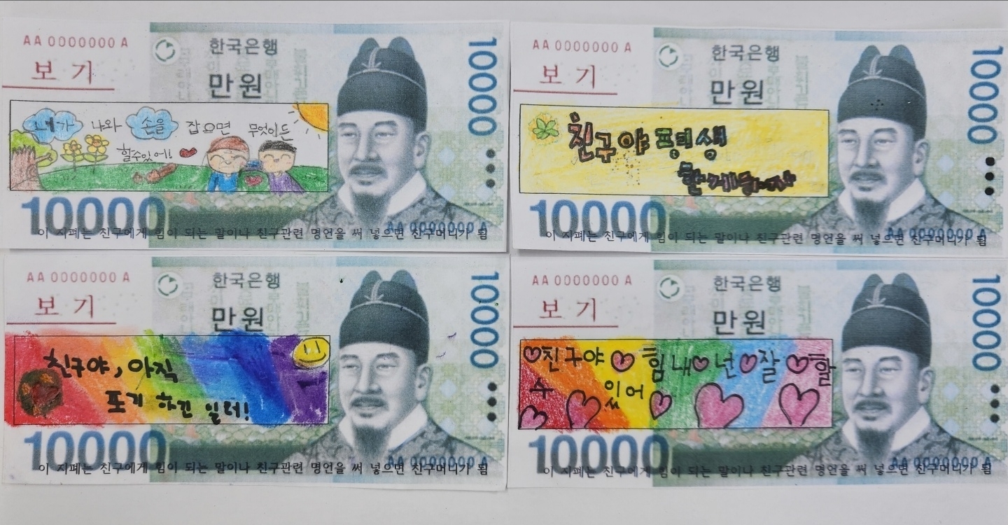 □ 전교생을 대상으로 한 ‘친구사랑 선물가게’행사는 학생들이 모형 지폐에 친구 관련 명언이나 친구에게 힘이 될 수 있는 말을 적어오면 친구사랑머니가 되어 친구사랑 머니를 선물로 바꾸어 주는 행사이다. 이 행사는 친구를 사랑하는 마음이 기쁨이라는 감정으로 이어지는 경험을 할 수 있도록 마련되었다.
