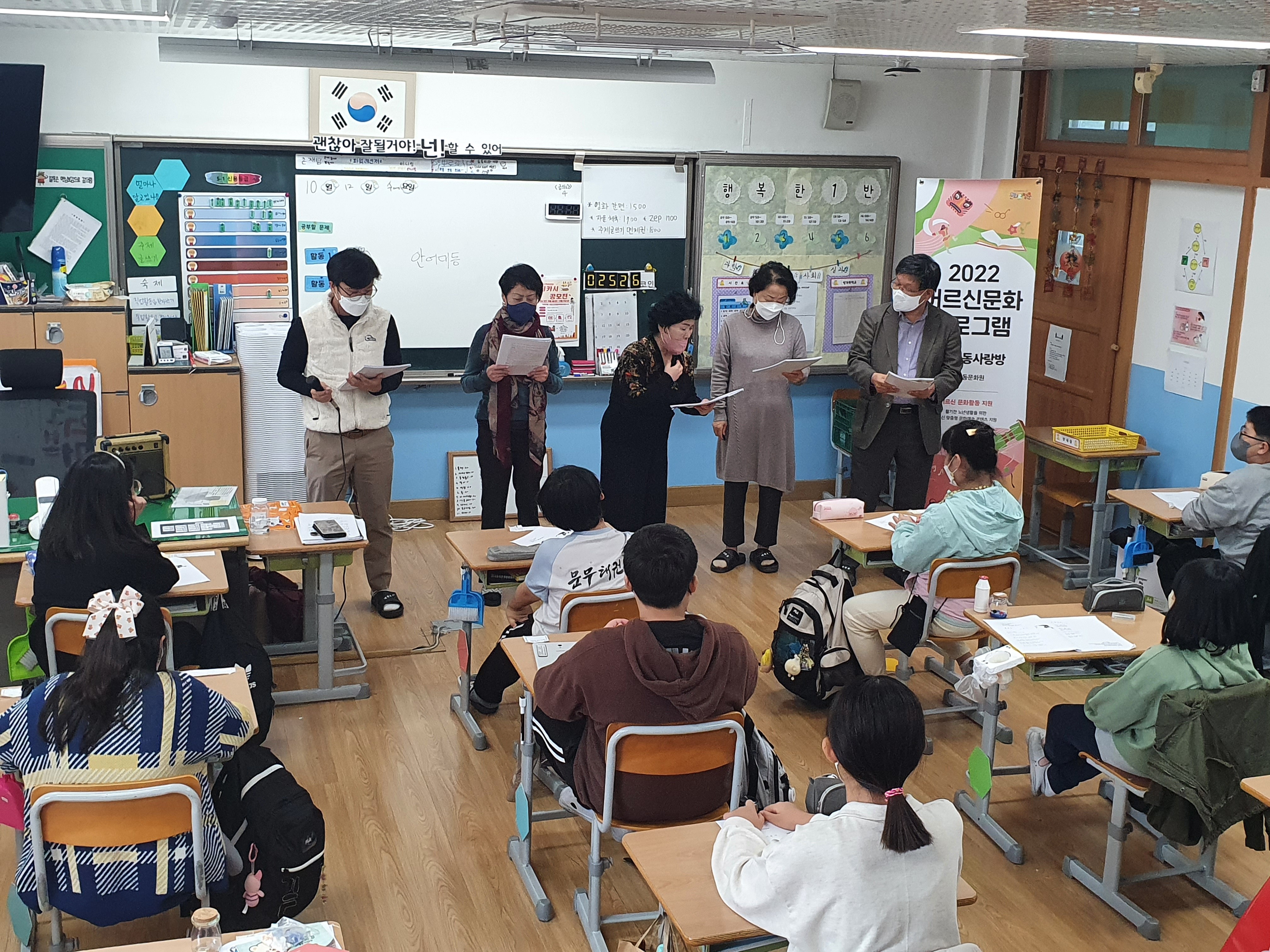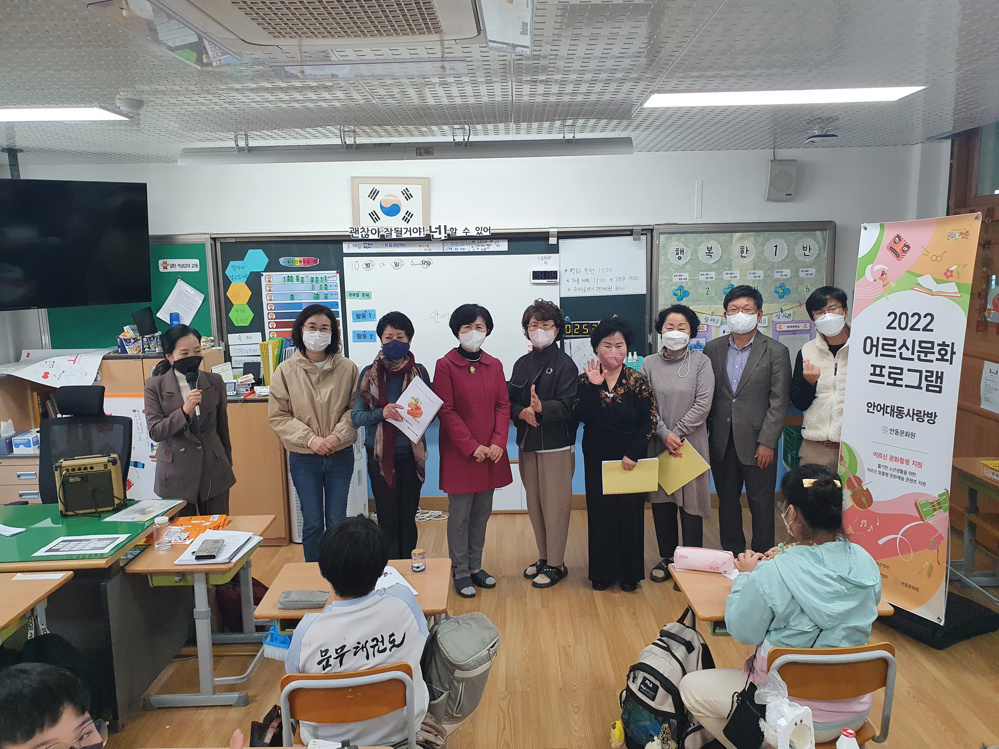 2022년 10월 12일(수) 영남초등학교(교장 장화선)에서는 2022 어르신문화 프로그램인 ‘안어대동 사랑방’행사가 있었다. ‘안어대동’은 안동의 어르신이 대화합을 한다는 의미로 직장에서 퇴직한 어르신이 학교나 지역기관을 찾아다니며 책읽어주기, 시낭송, 이야기하기 책 만들기 체험 등을 하는 활동이다.