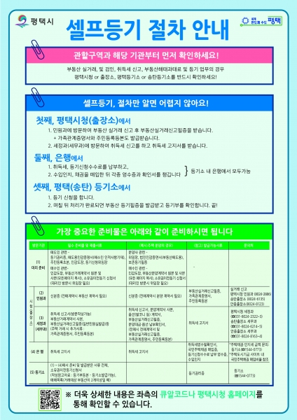 [금요저널] 평택시는 늘어나는 부동산 셀프 등기 수요에 발맞춰, 시 누리집을 통해 부동산 등기에 필요한 절차·기한·방법 등을 체계적으로 안내하는 원스톱 셀프 등기를 지원한다.