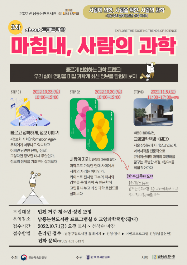 남동논현도서관은 앞서 1차 ‘꿈꿨던 과학, 꿈꾸는 과학’, 2차 ‘메타버스와 컴퓨터 게임, 그리고 사람들’에 이어 3차 프로그램 ‘마침내, 사람의 과학’을 오는 10월 23일부터 11월 5일까지 운영한다.