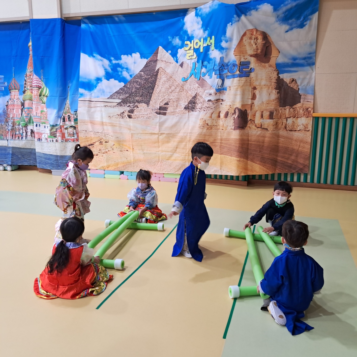 □ 사전활동으로 각 교실에서 여권 체험과 세계 여러나라의 놀이를 영상을 통해 이야기 나누며 다양한 문화를 이해하는 시간을 가졌다. 키즈카페에서는 친구들과 함께 여권을 들고 세계 여행 체험을 하며 즐거워 하였다. 강당에서는 세계 여러 나라의 놀이 깐항 체험, 코코넛 밟기, 접기(버나)돌리기, 티니클링, 죽마놀이, 스쿠프 놀이, 림보놀이, 밤부피트 등을 체험하며 “밤부피트는 우리가 하는 볼링 같아요.”, “티니클링은 고무줄 놀이 같아요.”,“림보는 잘 넘어갈 수 있어요.”라며 자신감 있게 참여하였고, “친구와 함께 타니까 더 재미있어요.”라고 말하며 즐겁게 축제에 참여하였다.