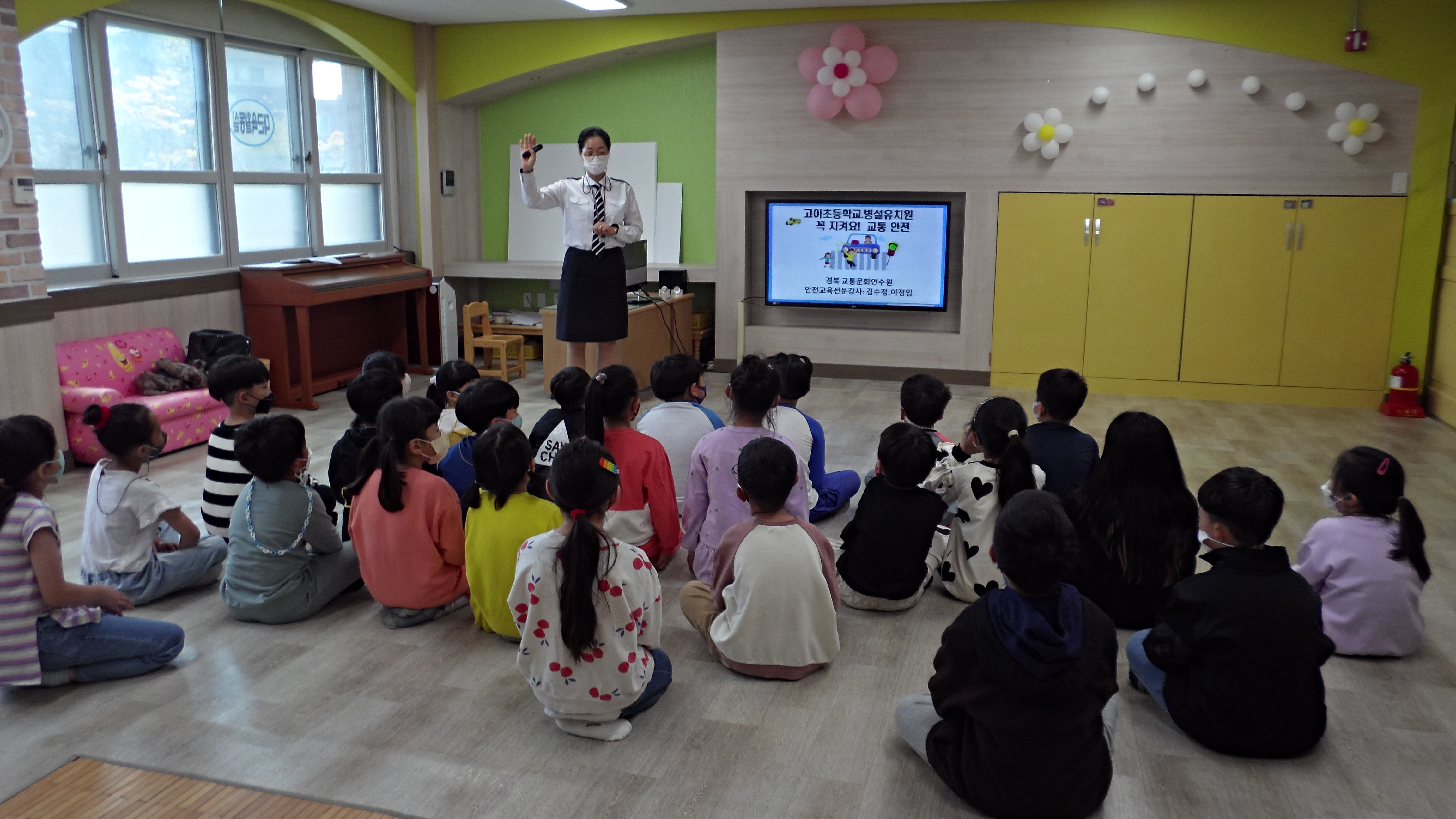 □ 이번 교통안전교육은 학교를 직접 방문하여 학생들의 수준에 맞게 맞춤형으로 진행되었으며, 내용은 교통신호의 의미, 교통안전 행동 요령, 교통예절, 야외 놀이 시 주의사항, 신호등 건너기를 직접 실습해보는 시간을 가졌다.