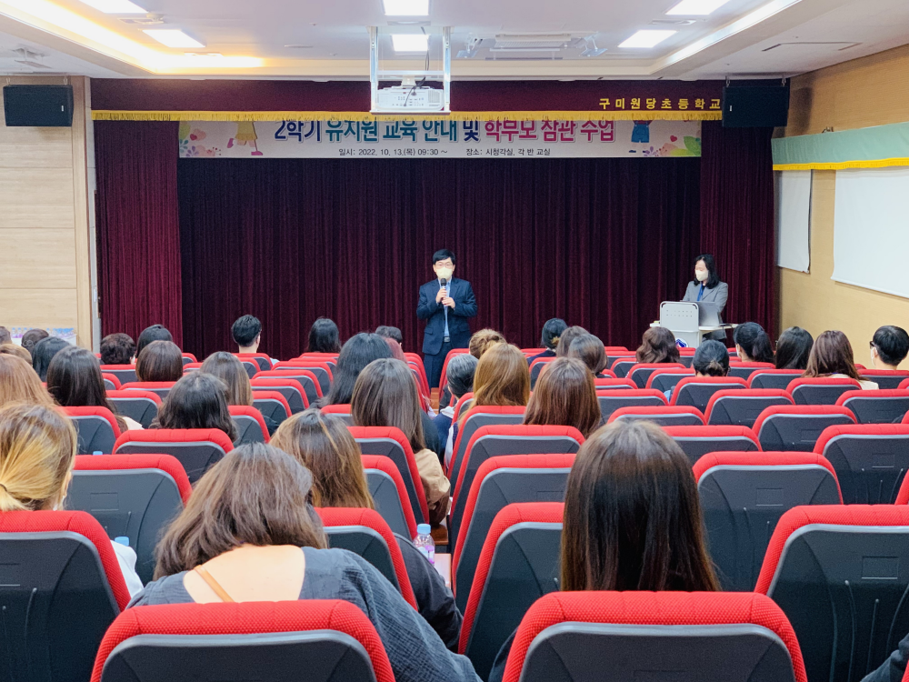 □ 구미원당초등학교병설유치원(원장 김광식)은 10월 13일(목) 전체 학부모를 대상으로 유치원 교육 안내 및 학부모 참관 수업을 실시하였다.