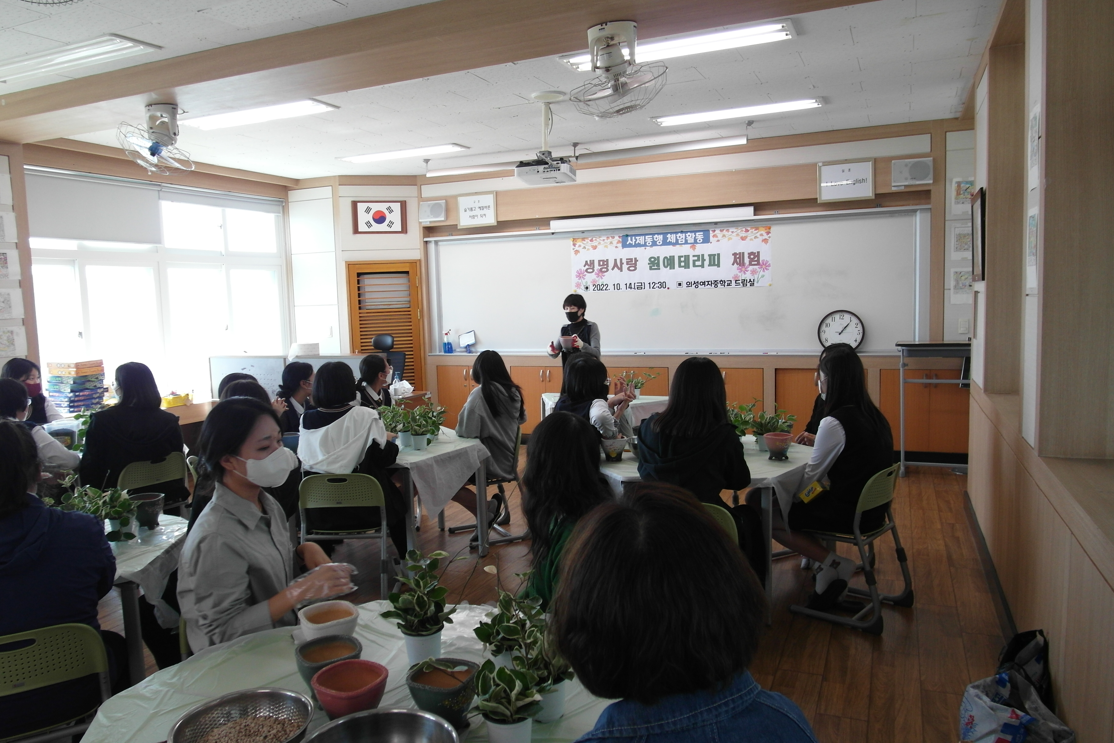 의성여자중학교(교장 문영수) 위클래스는 10월 14일(금) 1, 2학년 학생과 담임교사 30명을 대상으로 생명사랑 활동의 일환으로 ‘사제동행 생명사랑 원예테라피’ 체험활동 프로그램을 실시하였다.