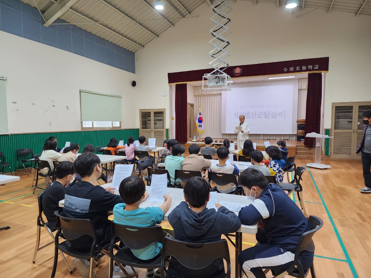 □ 수비초등학교(교장 진형대)는 지난 17일 중요무형문화재 제69호 하회별신굿탈놀이 이수자 류필기 씨를 강사로 초청하여 경북 안동 사투리 및 하회별신굿탈놀이를 배워보는 시간을 마련하였다.