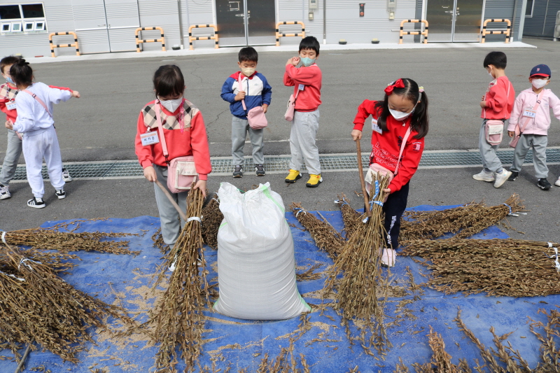 ▣ 참깨가공유통센터에 도착한 유아들은 먼저 참깨의 재배과정을 관찰하고 깻단을 직접 털어보며 수확의 기쁨을 느껴보기도 하였다. 공장을 둘러보면서 참기름이 만들어지는 과정을 살펴본 후 참기름을 넣어 주먹밥을 만들어보는 체험으로 이어졌다. 요리활동을 하기 전 마스크 바르게 착용하기, 손 씻기 등 다시 한번 예방수칙을 강조하여 감염병 예방을 위해 힘썼다.