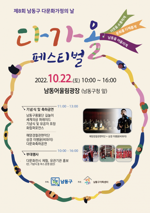 올해로 8회를 맞는 이번 행사는 ‘이웃을 소통하게, 문화를 다채롭게, 남동을 어울리게’라는 슬로건으로 다문화가족과 내국인이 함께하는 화합과 축제의 한마당을 펼칠 예정이다.