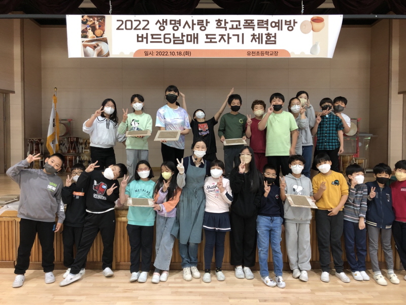 □ 유천초등학교(교장 정점자)에서는 전교생(62명)을 대상으로 10월 18일(화) 생명사랑 학교폭력예방 버드내6남매 도자기체험활동을 실시하였다. 이 프로그램은 학교폭력예방 및 생명존중 문화 확산의 기반 조성을 위해 시행되었다.