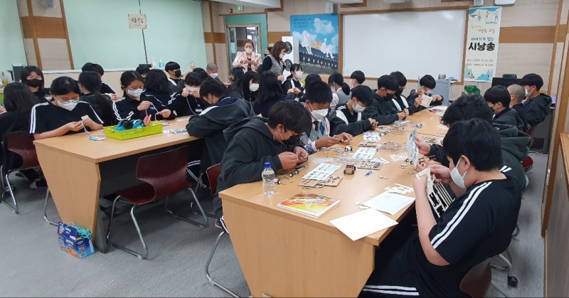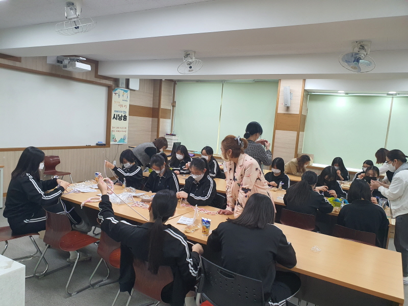 ◇ 1부에서는 학교도서관에서 점심시간을 이용하여 자유롭게 참여하는 학생들의 만들기 체험(여러 종류의 마크라메, 캔버스 압화, 조립 등)을 직접 지도하였는데, 학부모가 미리 샘플을 만들어 학생들에게 보여주며 가르쳐 주었고, 이어서 2부에서는 진로활동실에서 학부모들이 참여하는 가죽공예 체험을 하면서 의미 있는 시간을 보냈다.
