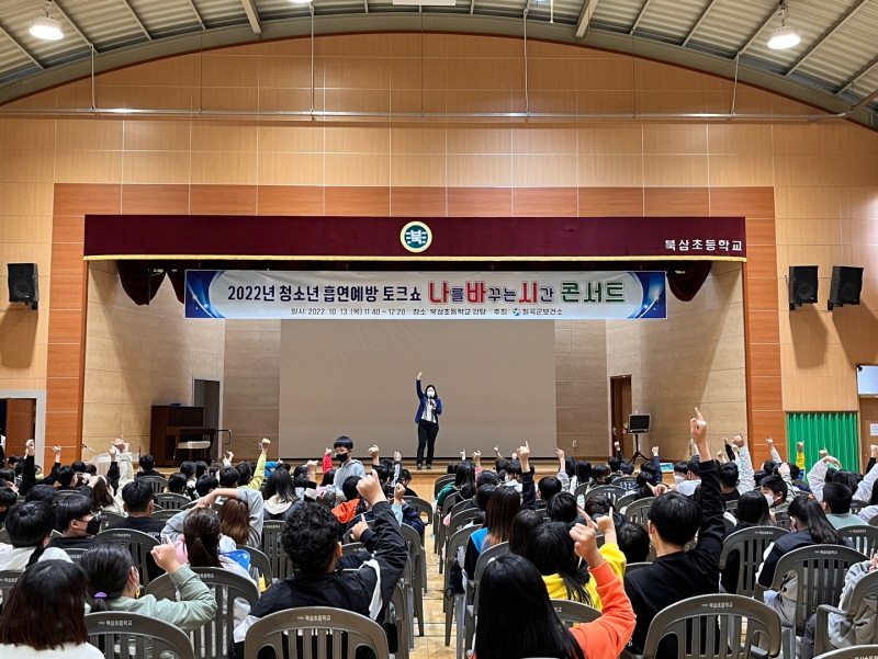 ▣ 북삼초등학교(교장 김혜려)는 2022년 10월 13일(목) 본교 5학년 학생(164명)을 대상으로 칠곡군 보건소 연계 청소년 흡연예방 토크쇼‘나(를) 바(꾸는) 시(간) 나바시 콘서트’를 실시하였다.
