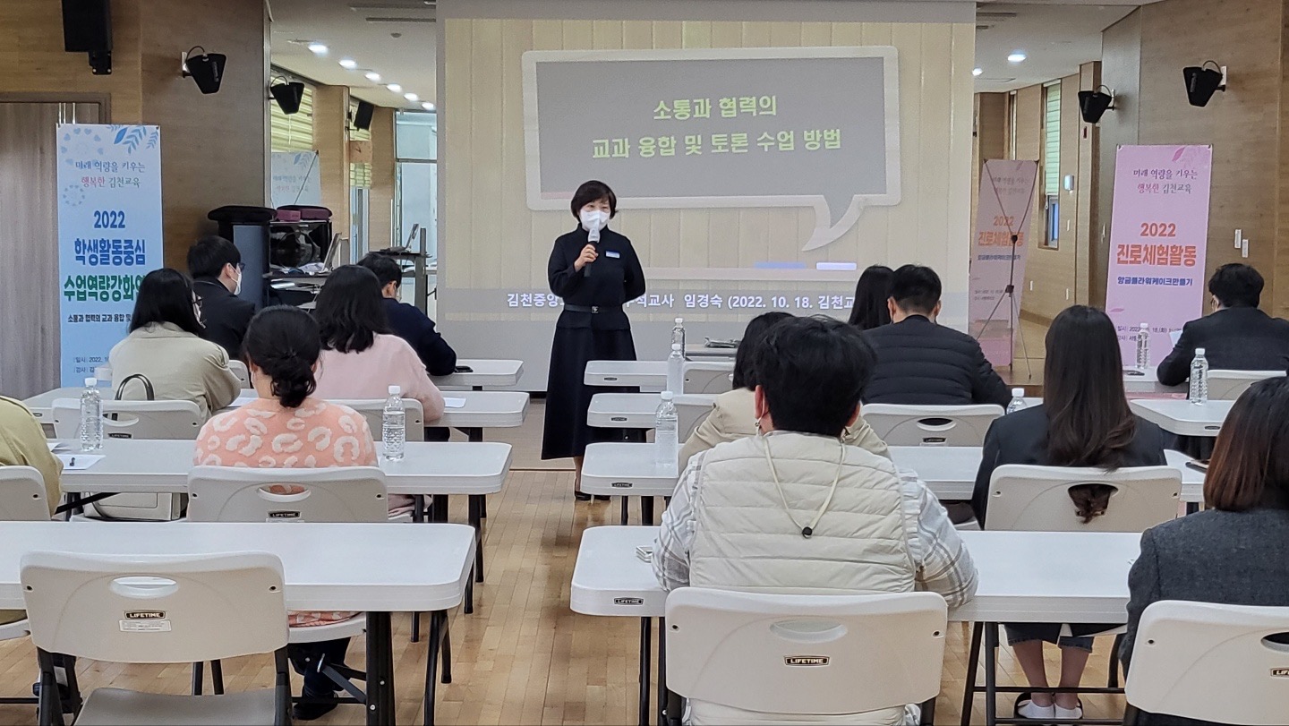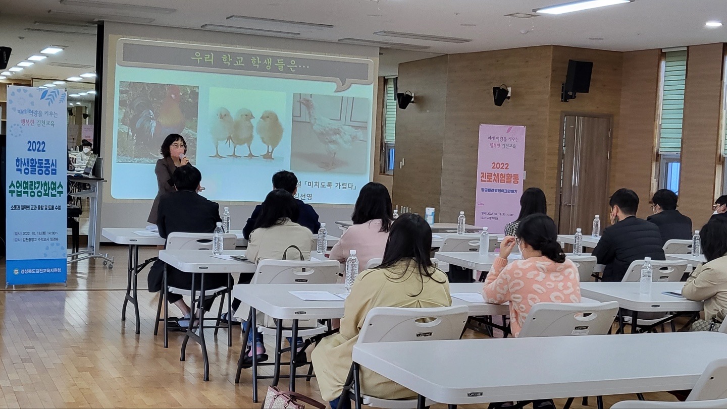 □ 김천교육지원청(교육장 박삼봉)에서는 10월 18일(화) 14시, 학생문화예술센터 춤선놀이터에서 김천관내 중·고 교사를 대상으로 학생활동중심 수업 역량 강화 연수를 실시하였다.