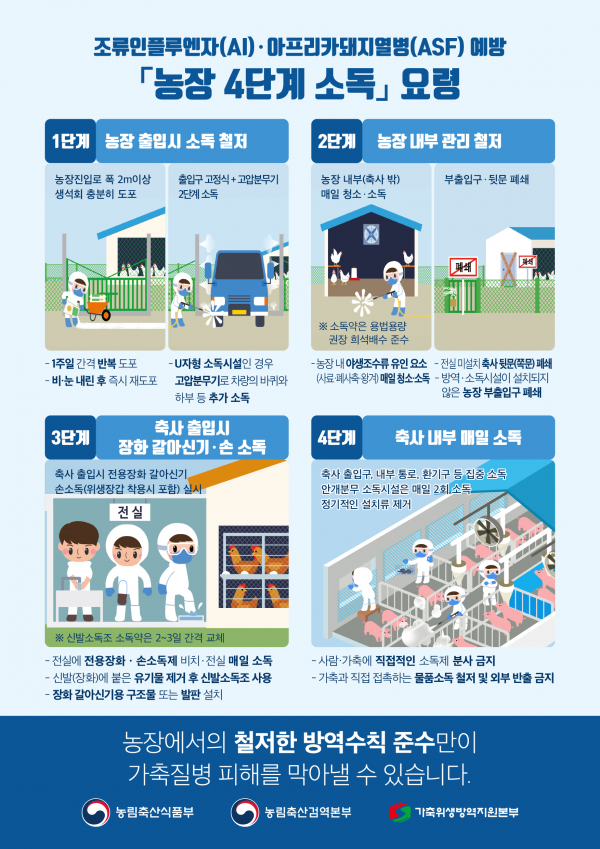 중수본은 조류인플루엔자 예방과 확산방지를 위해 농장진입로 생석회 도포, 축사 출입 전 손 소독 및 장화 갈아신기, 축사 내·외부 매일 청소 등 농장 4단계 소독을 철저히 준수해 줄 것을 강조했다.