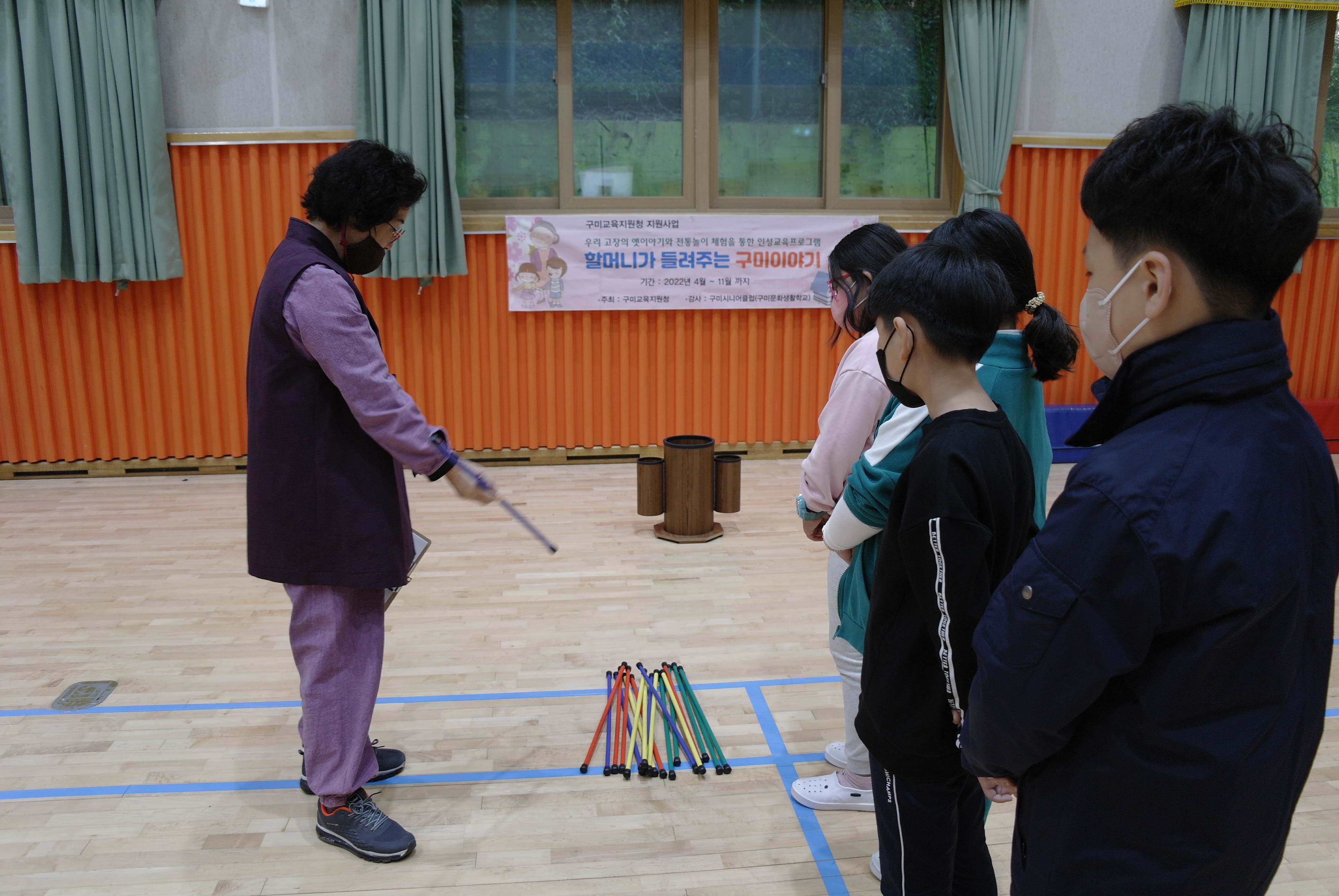 ♣ 전통 놀이 체험을 통한 인성교육은 구미시니어클럽 구미문화 생활학교에서 5명의 강사들이 본교에 와서 전통 놀이 중 한궁, 투호, 전통 제기차기 등 3종류의 놀이를 3개조로 편성하여 팀티칭 방식으로 학생들에게 알려주었다.