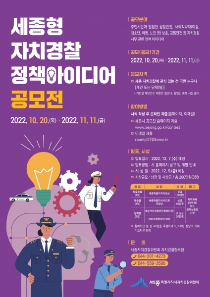 [금요저널] 세종특별자치시자치경찰위원회가 지역밀착형 자치경찰 시책발굴과 세종자치경찰에 대한 대국민 홍보를 위해 ‘세종형 자치경찰 정책아이디어 공모전’을 20일부터 11월 11일까지 개최한다.