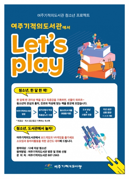 [금요저널] 여주시 평생교육과 여주기적의도서관은 2022년 10월 20일부터 청소년 도서관 이용 활성화와 독서 생활화를 위해 ‘청소년, 한 달 한 책’과 ‘청소년, 도서관에서 놀자’ 등 2개 프로그램을 운영한다.