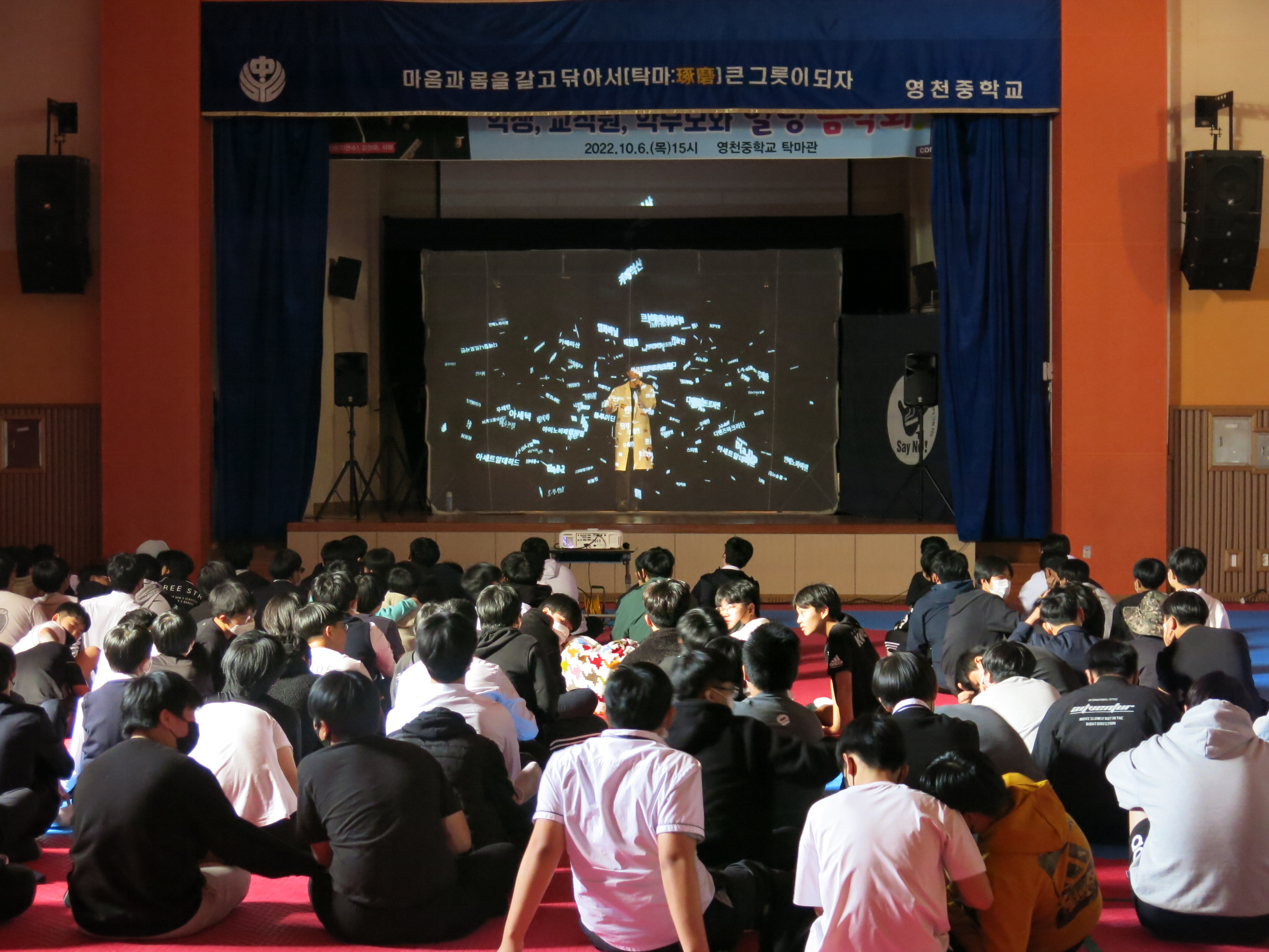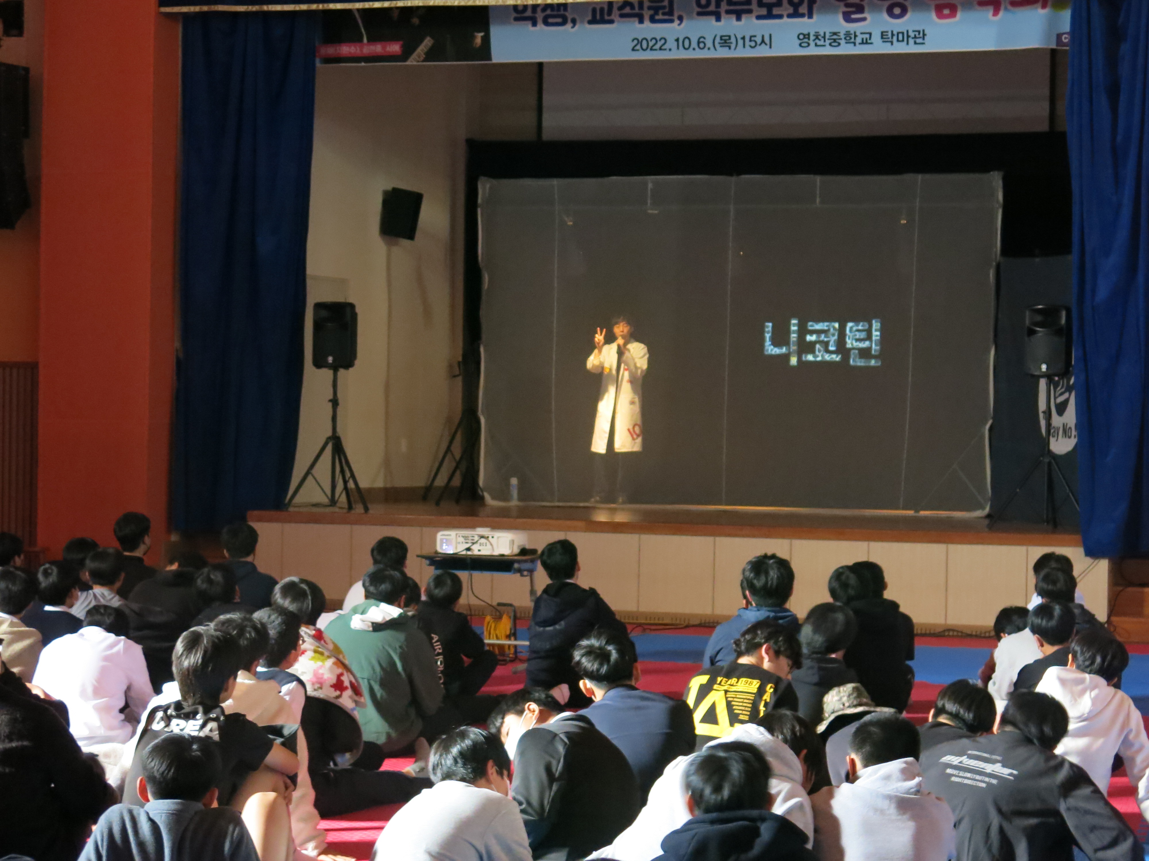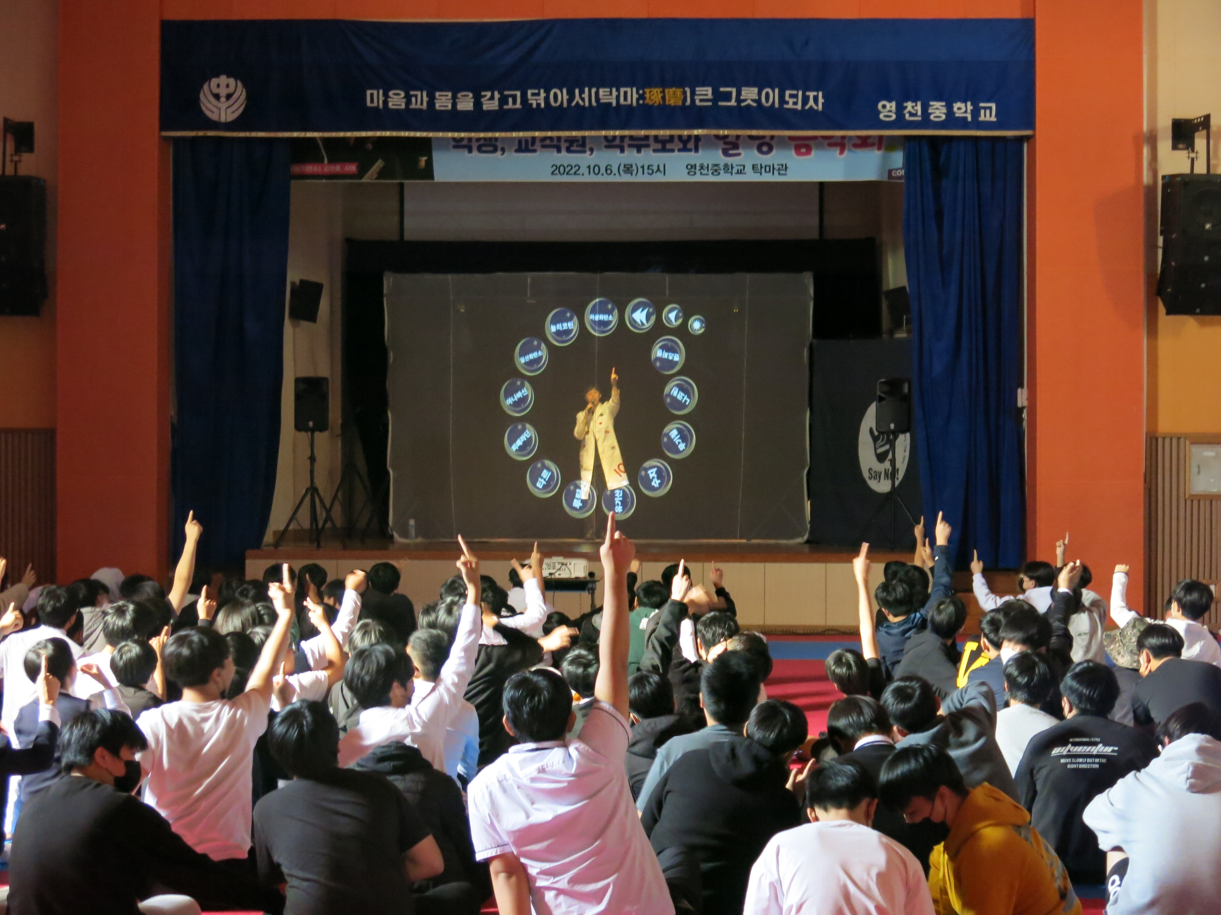 영천중학교(교장 김미라)는 2022년 10월 19일(수) 학생들을 대상으로 학생 흡연예방 홀로그램 공연을 진행했다. 이번 행사는 2022학년도 흡연예방 및 금연 실천 심화형 학교 운영의 일환으로 기획하였으며, 효과적인 교육을 위해 학년별로 나누어 공연을 관람했다.