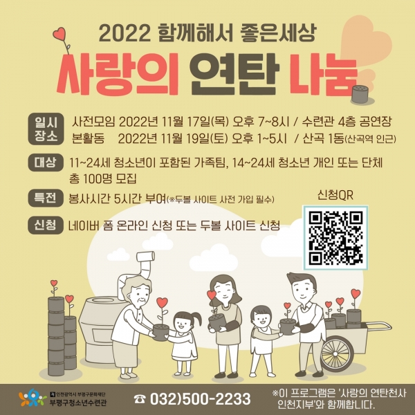 이번 봉사활동은 지난해에 이어 두 번째로 진행하는 연탄 나눔 봉사활동으로 오는 11월 19일 산곡1동 연탄 사용 가정에 청소년과 가족이 함께 4천여 장의 연탄을 배달할 예정이다.