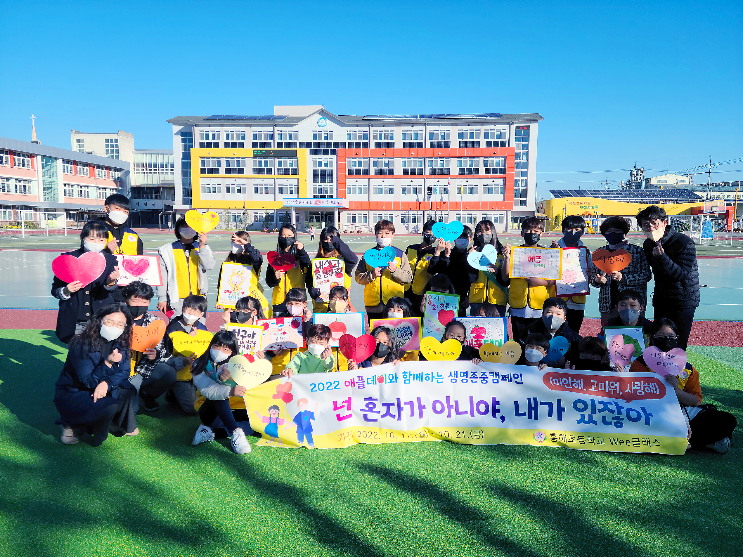 ▣ 포항 흥해초등학교(교장 김영미)는 10월 20일 전교생 및 전교직원을 대상으로 서로 아끼고 배려하는 학교문화를 가꾸어 생명사랑을 실천하고자 2022학년도 애플데이와 함께하는 생명존중 캠페인을 실시하였다.