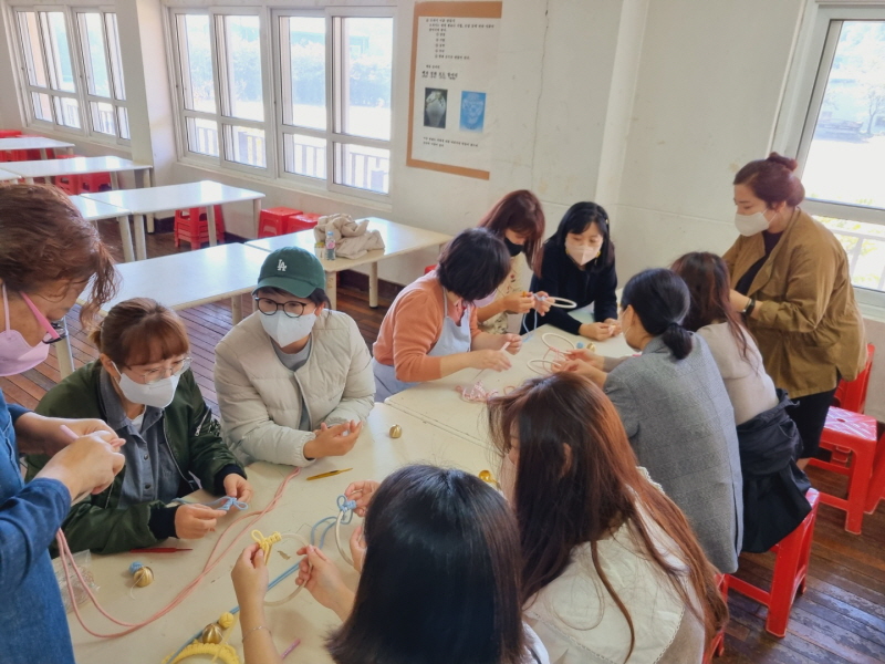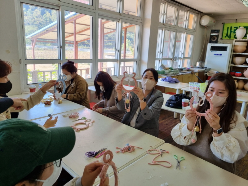 □ 석적유치원(원장 김순복)은 10월 20일(목) 방과후 놀이쉼터 학부모 놀이지원단을 대상으로 연화예술원에서 마크라메종 매듭공예 연수 및 평가간담회를 실시하였다.