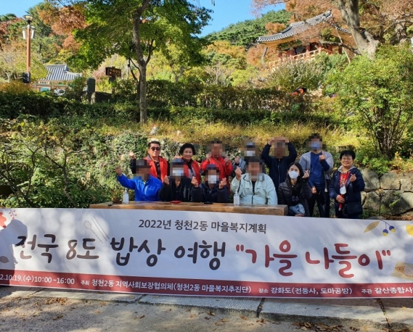 [금요저널] 부평구 청천2동 지역사회보장협의체는 지난 19일 강화도 전등사에서 ‘중장년 홀몸남성 전국 8도 밥상 여행’ 가을 나들이 행사를 진행했다.