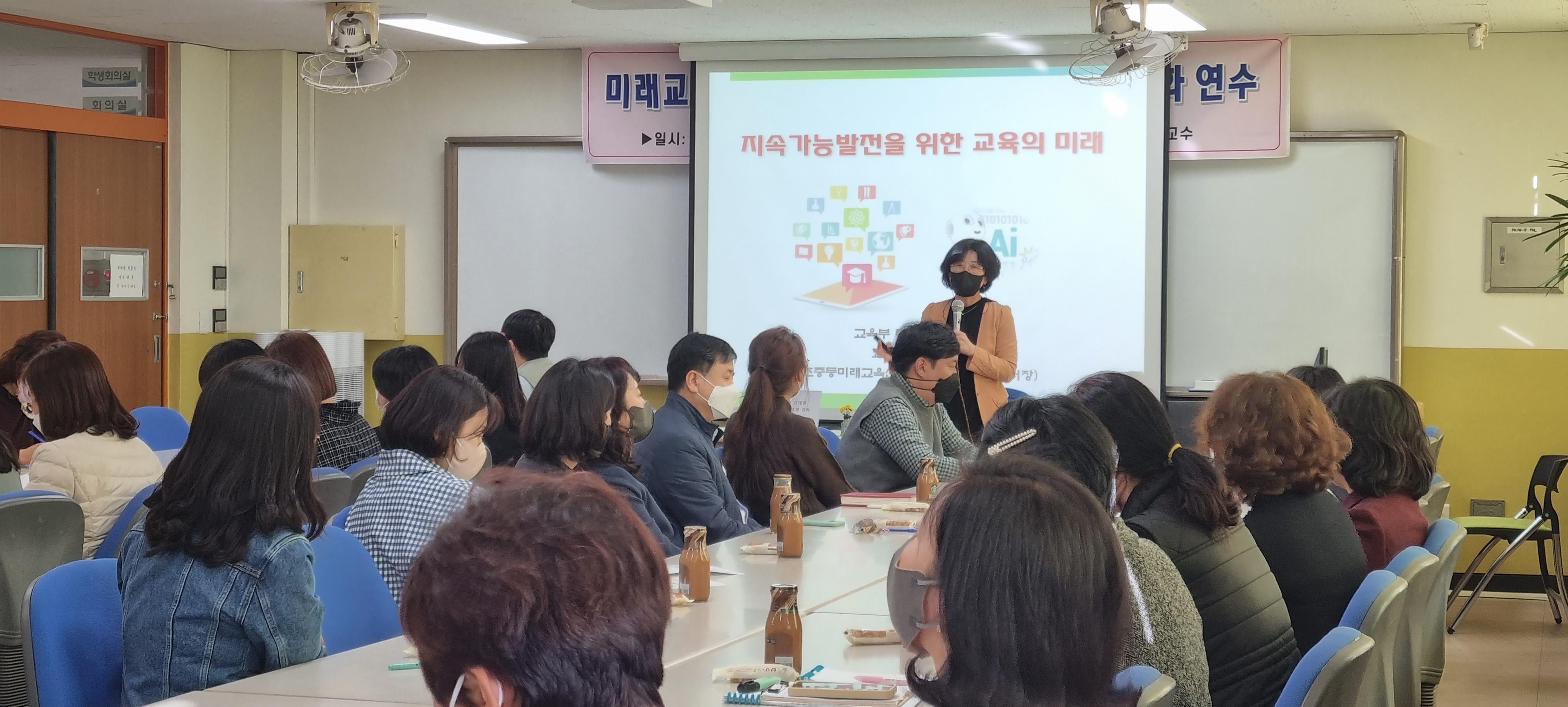 □ 이번 연수는 미래 교육 전환을 위한 교원 전문성 신장 및 교실 수업 개선 역량 강화를 높이기 위해 마련하였다. 교육부 중앙교육연수원 하영자 교수가 ‘지속가능 발전을 위한 교육의 미래’를 주제로 강연하여 미래학교 관련 교육내용과 사회 변화에 따른 지속가능 발전에 대한 전략과 방법을 알기 쉽게 접근하여 큰 호응을 얻었다.
