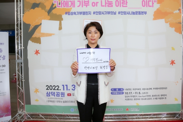 최병일 의장은 ”나에게 나눔이란 사랑이다“라는 문구를 작성한 뒤, “코로나19와 최근 물가상승으로 힘든 시간을 보내는 저소득 취약계층을 생각하며 일상 속 기부 챌린지에 많은 시민이 참여해 지역사회 나눔 문화가 퍼지길 바란다”고 소감을 밝혔다.