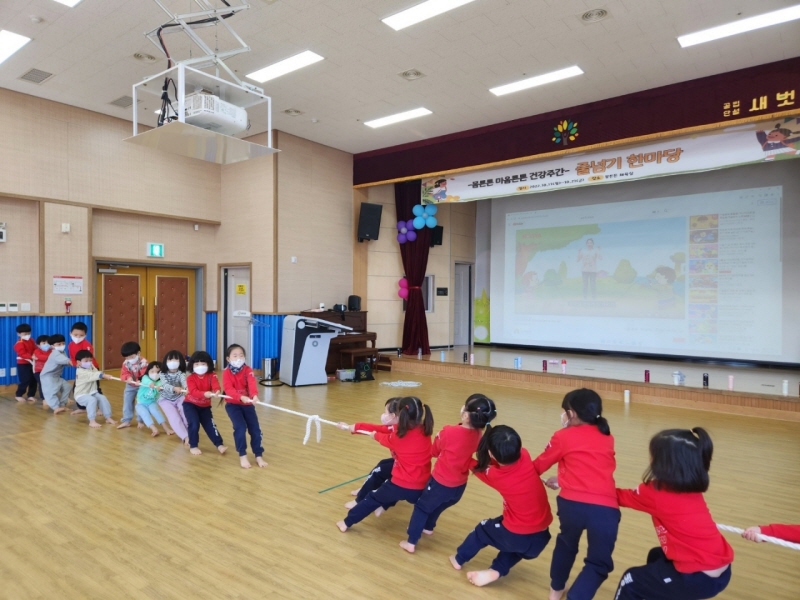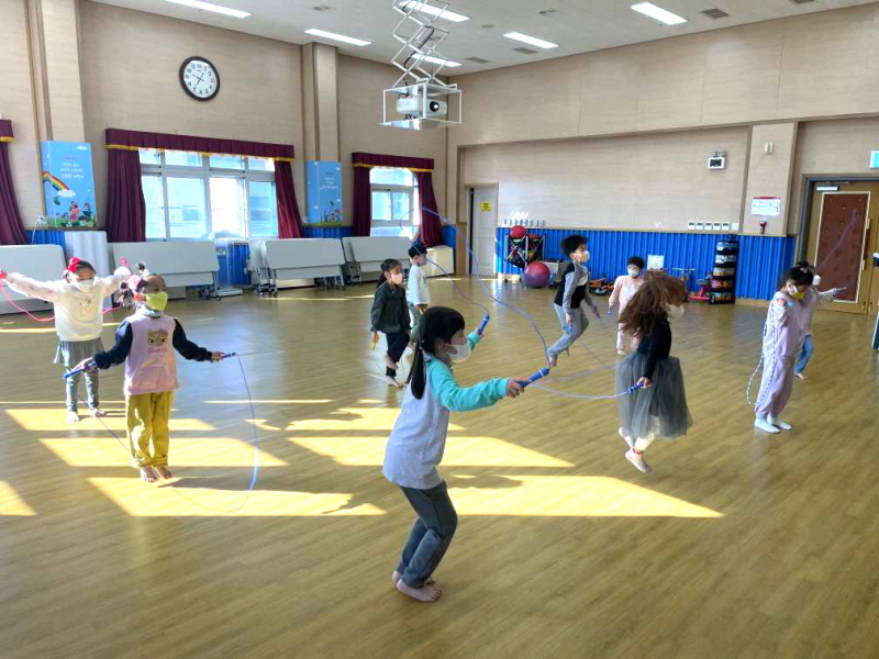 또 5세는 줄넘기, 단체줄넘기 등 줄넘기 오래 넘기 대회를 개최하여 운동 과정의 성취감을 느껴보기도 하였다. 건강주간 마지막날 유아들은 “친구들이랑 같이 해서 너무 재미있어요”, “앞으로도 줄넘기 연습은 계속할 거예요.”라며 다짐하기도 했다.