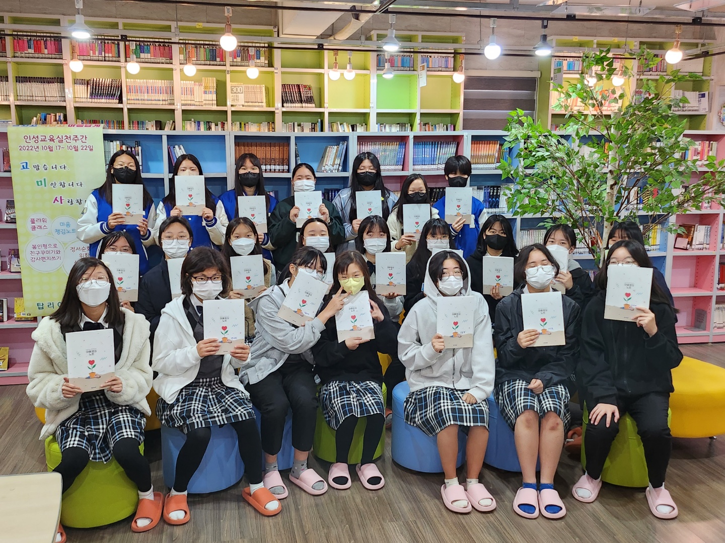 이00 학생은 “인성교육실천주간을 통해 자신의 정체성을 찾아가고 사랑하면서 평안이라는 감정들을 느끼며 누릴 수 있어 좋았고 자존감도 더 건강해지고 선・후배들과 함께 작품을 만들어가면서 서로를 더 잘 알아가게 되고 협동심도 기르고 마음이 따뜻해지는 좋은 시간이었다.”고 소감을 적었다.