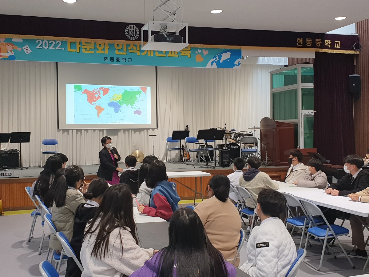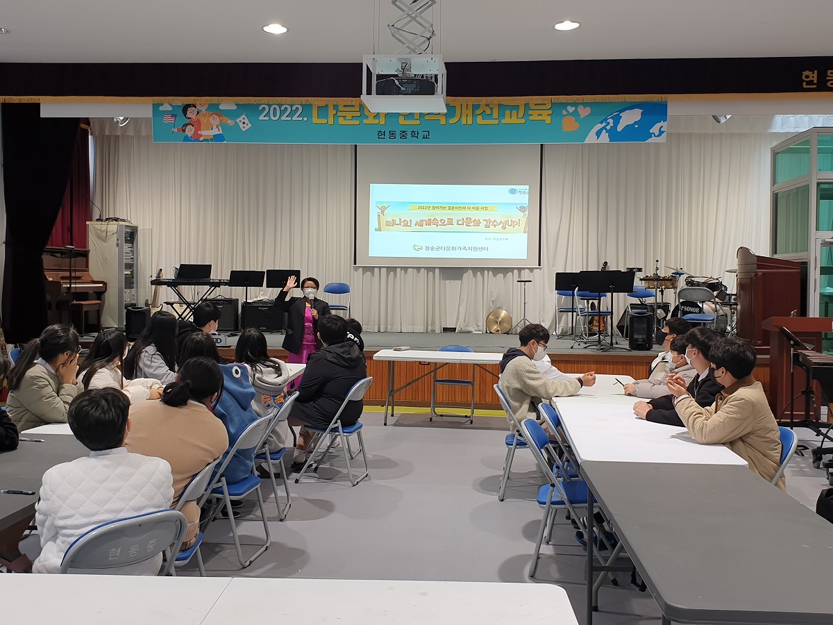 - 현동중학교(교장 김양훈)는 10월 21일(목) 6, 7교시에 본교 강당에서 전교생을 대상으로 다문화이해교육을 실시하였다. 강의는 청송군 다문화가족지원센터에서 필리핀 출신의 다문화교육 전문강사가 맡았다.