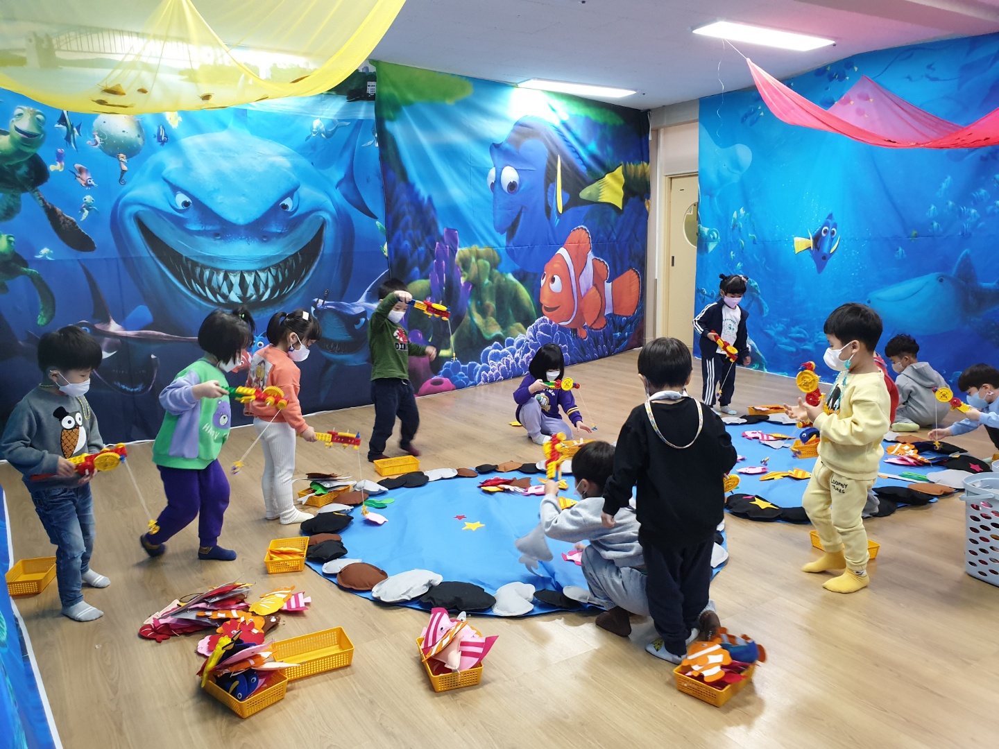 □ 블록놀이는 교실을 4면을 놀이에 맞게 현수막으로 설치한 후 뻐끔뻐금 낚시, 데굴데굴 스포츠, 룰루랄라 플레이, 알록달록 벌크존으로 4코너로 진행되었다.