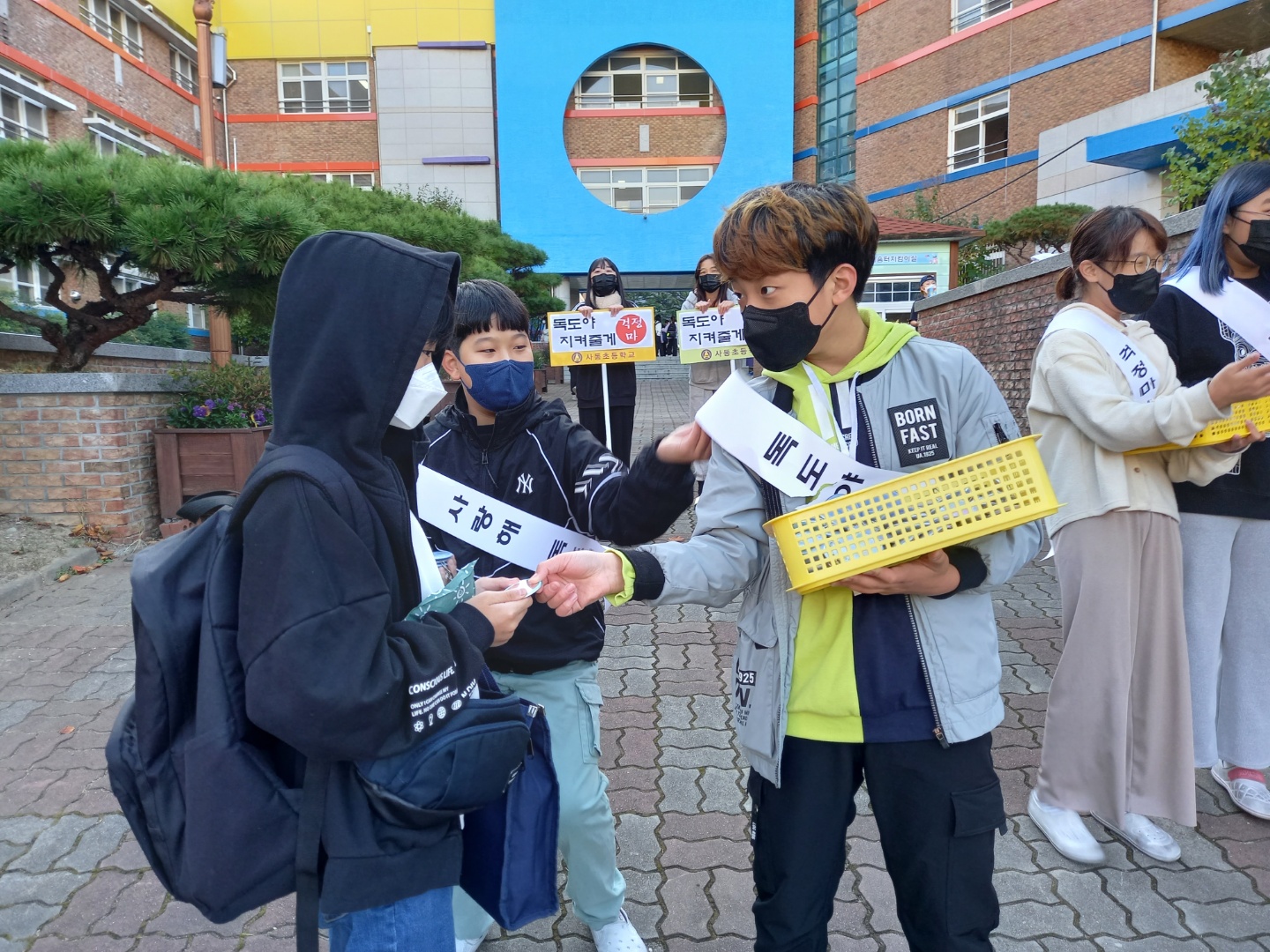 독도지킴이 동아리 회원들은 “독도야, 지켜줄게!” 알림판과 “걱정마, 지켜줄게‘ 문구가 적힌 어깨띠를 두르고 교문에서 등교하는 친구들을 맞이하며 독도가 우리 대한민국의 영토임을 인식시키고, 독도의 중요성과 독도 수호의 의지를 함께 다지는 활동을 하였다. 그리고 동아리 회원들이 직접 제작한 ‘독도 거울’, ‘독도 열쇠고리’, ‘독도 배지’를 한사람 한사람에게 나누어 주며 독도를 사랑하고 함께 지켜줄 것을 당부하였다.