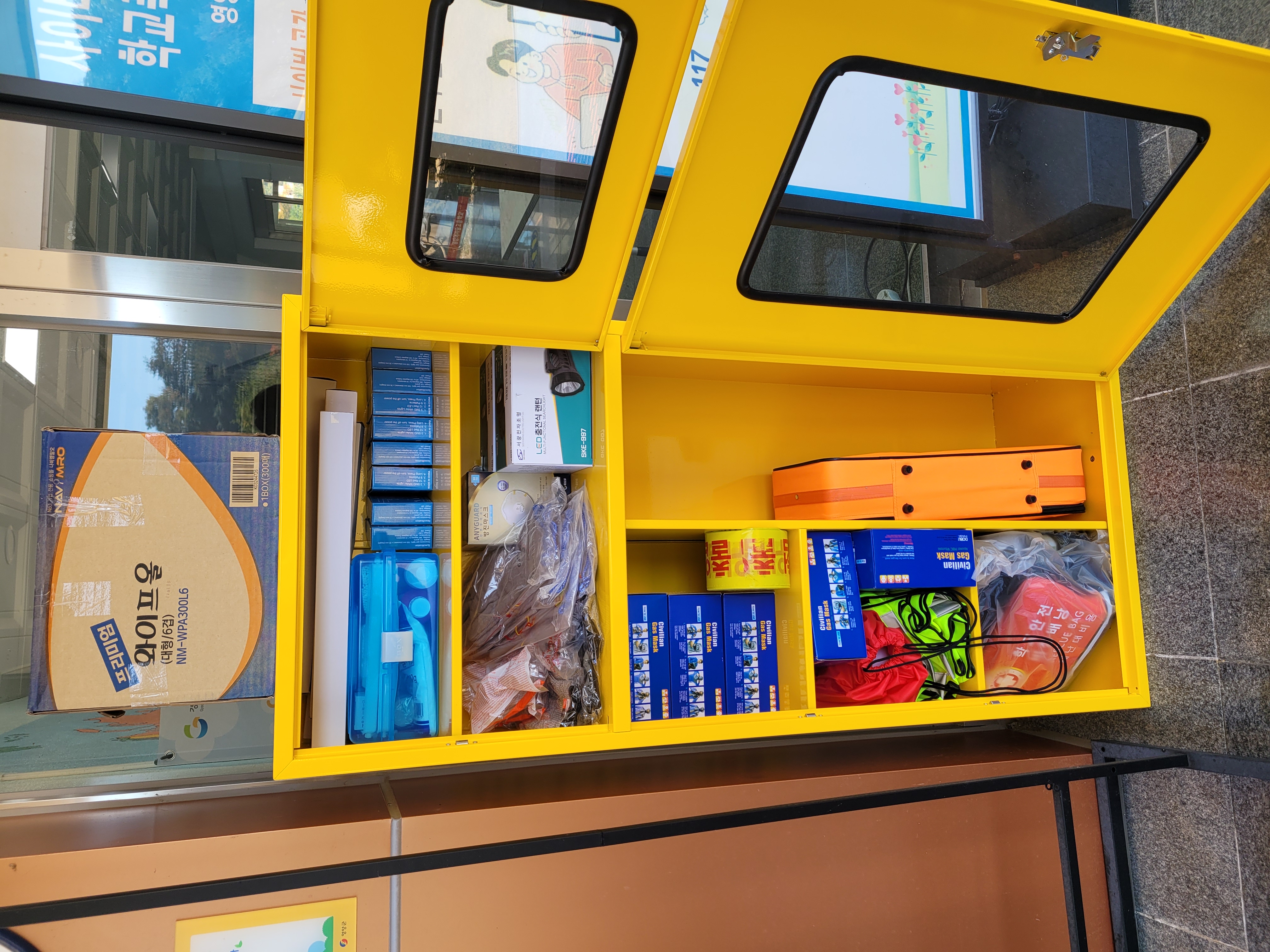 □ 학교의 사전 수요조사 의견을 바탕으로, 비상시 인명 구조를 위한 피난유도등, 학교비상배낭, 안전모, 경광봉, 호각, 구급상자, 들것 등으로 보호구함을 구성하였으며, 접근성이 가장 좋은 각 기관의 중앙현관 1층에 비치했다.