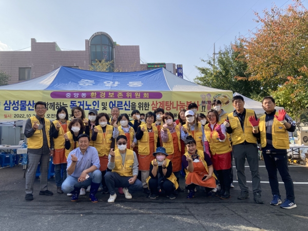 이날 행사를 위해 ㈜삼성물산에서 삼계닭 700마리 및 요구르트를 후원했으며 중앙동 위원회 위원들이 물티슈, 두유, 생수 등을 십시일반 지원해 행사에 의미를 더했다.