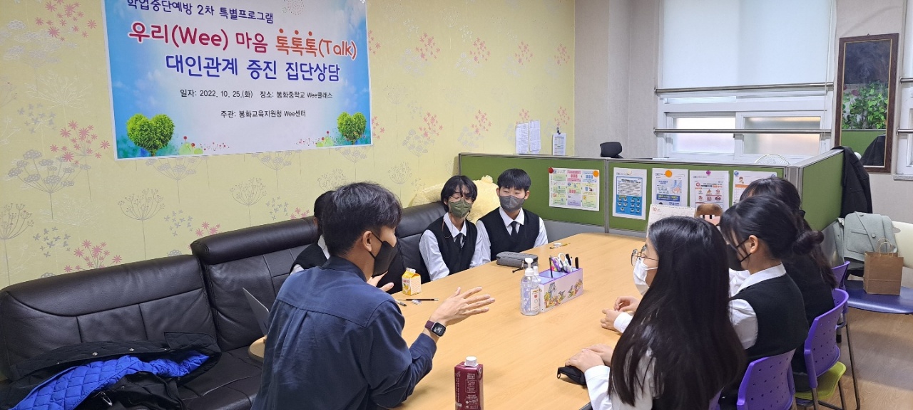 경상북도봉화교육지원청(교육장 박명호) Wee센터는 2022년 10월 25일(화) 봉화중학교 Wee클래스에서 또래상담학생 및 신청학생들을 대상으로 학업중단예방을 위한 2차 특별프로그램을 실시했다.