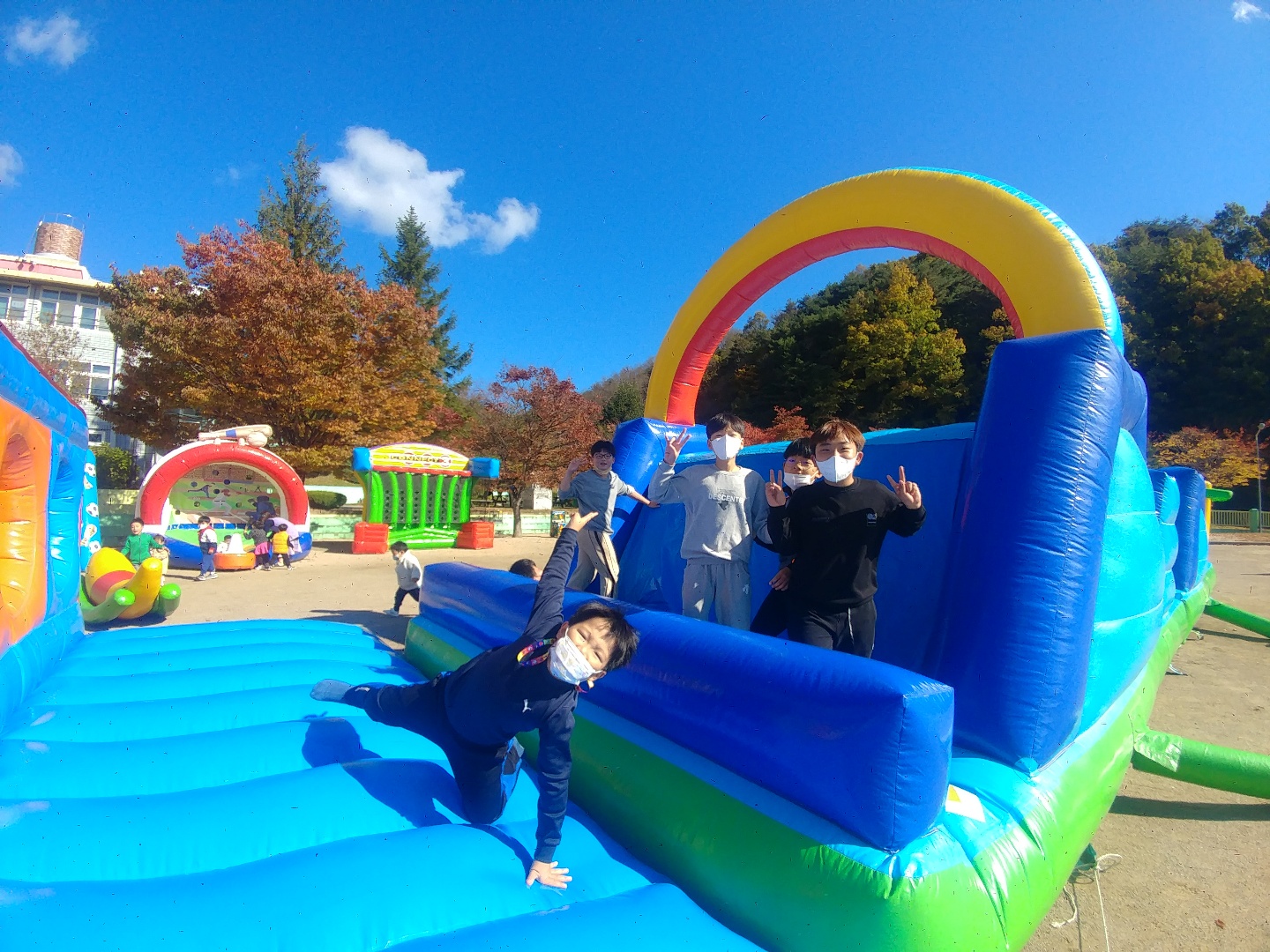 □ 본교운동장에 체험활동 놀이터를 설치하여 슬라이드, 스포츠바운스, 바이킹, 스포츠 게임기, 시소, 깡통, 낙하산 바운스, 두더지 바운스 활동을 체험하는 즐거운 시간을 가졌다.