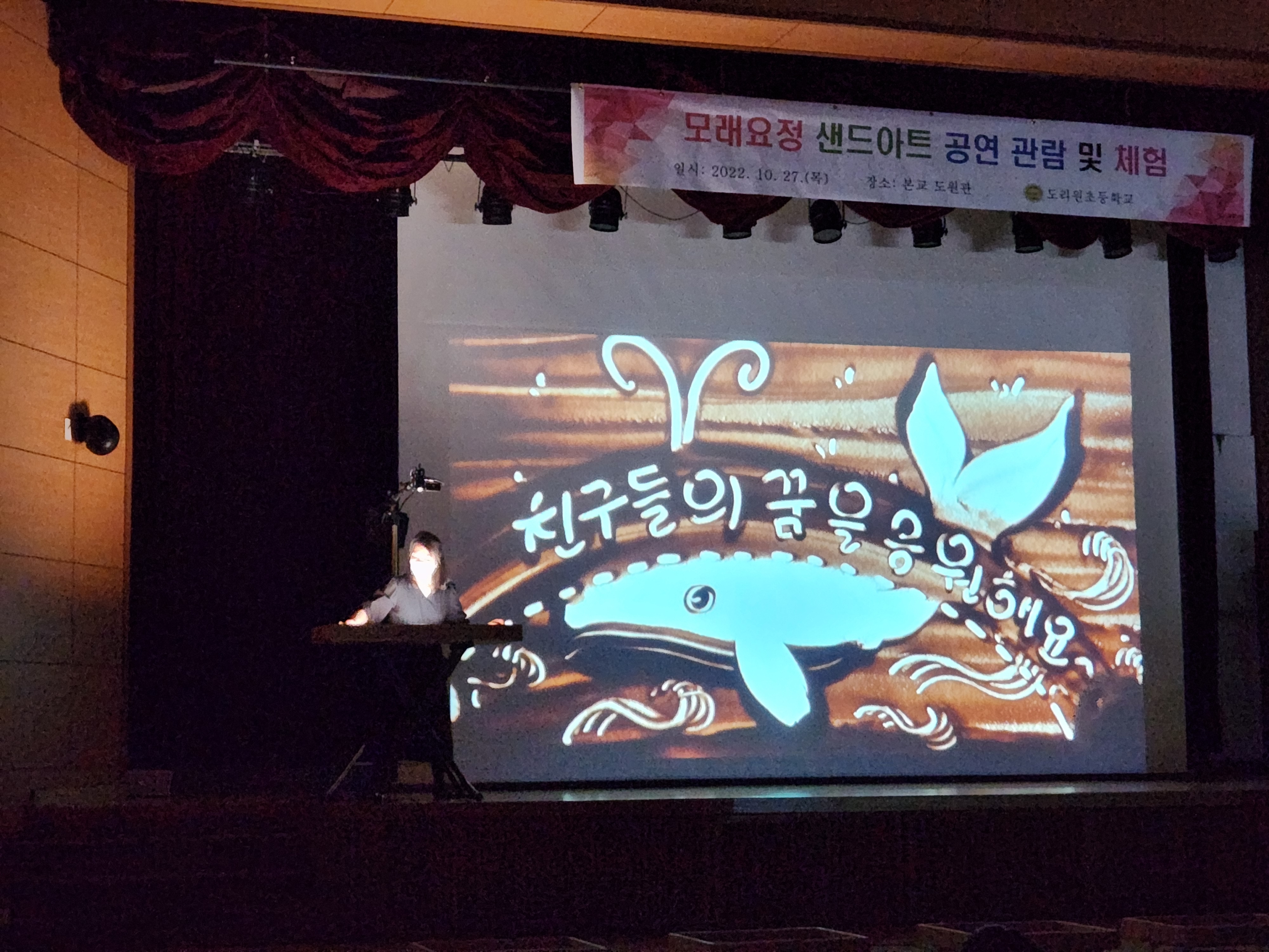 도리원초등학교(교장 정은순)는 10월 27일 목요일, 전교생을 대상으로 샌드아트 공연 관람 및 체험을 실시하였다. 샌드아트 공연은 다양한 표현기법으로 감동적인 스토리텔링을 함으로써 많은 사람들과 효과적이고 효율적인 커뮤니케이션을 나눌 수 있으며 체험을 통해서는 자신이 표현하고 싶은 다양한 이미지를 형상화해 창의력과 섬세한 예술성을 향상시킬 수 있다.