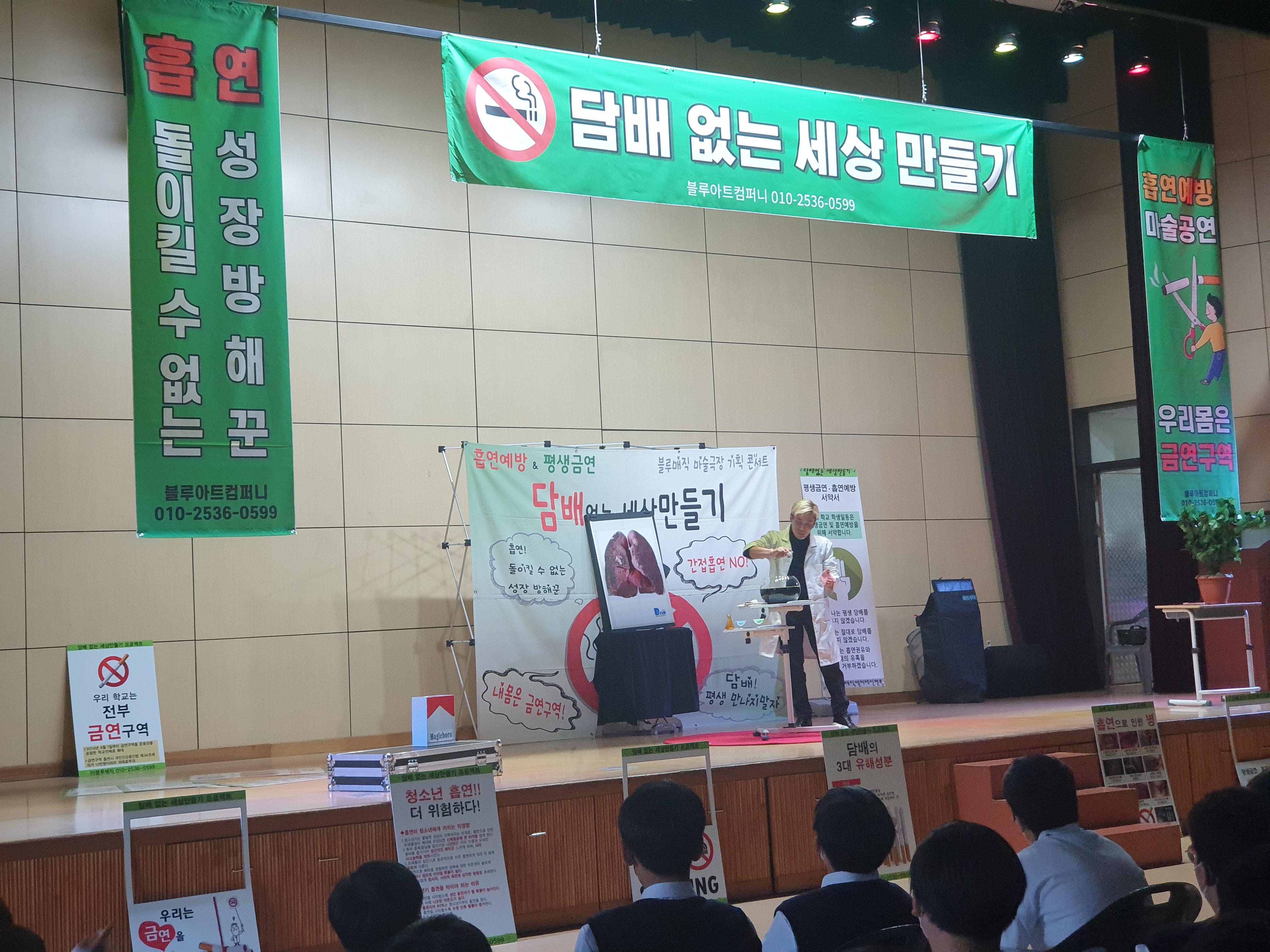 □ 10월 26일(수) 블루마술극단을 초청하여 전교생 및 교직원을 대상으로 마술을 접목시킨 흡연예방 및 금연교육을 실시하였다. 담배의 유해물질이 인체에 미치는 영향, 간접흡연의 위해성, 흡연을 하지 말아야 할 이유 등에 대해 마술을 접목한 공연교육을 실시하고, 학생대표(전교회장)와 함께 평생금연선서식을 실시하였다.