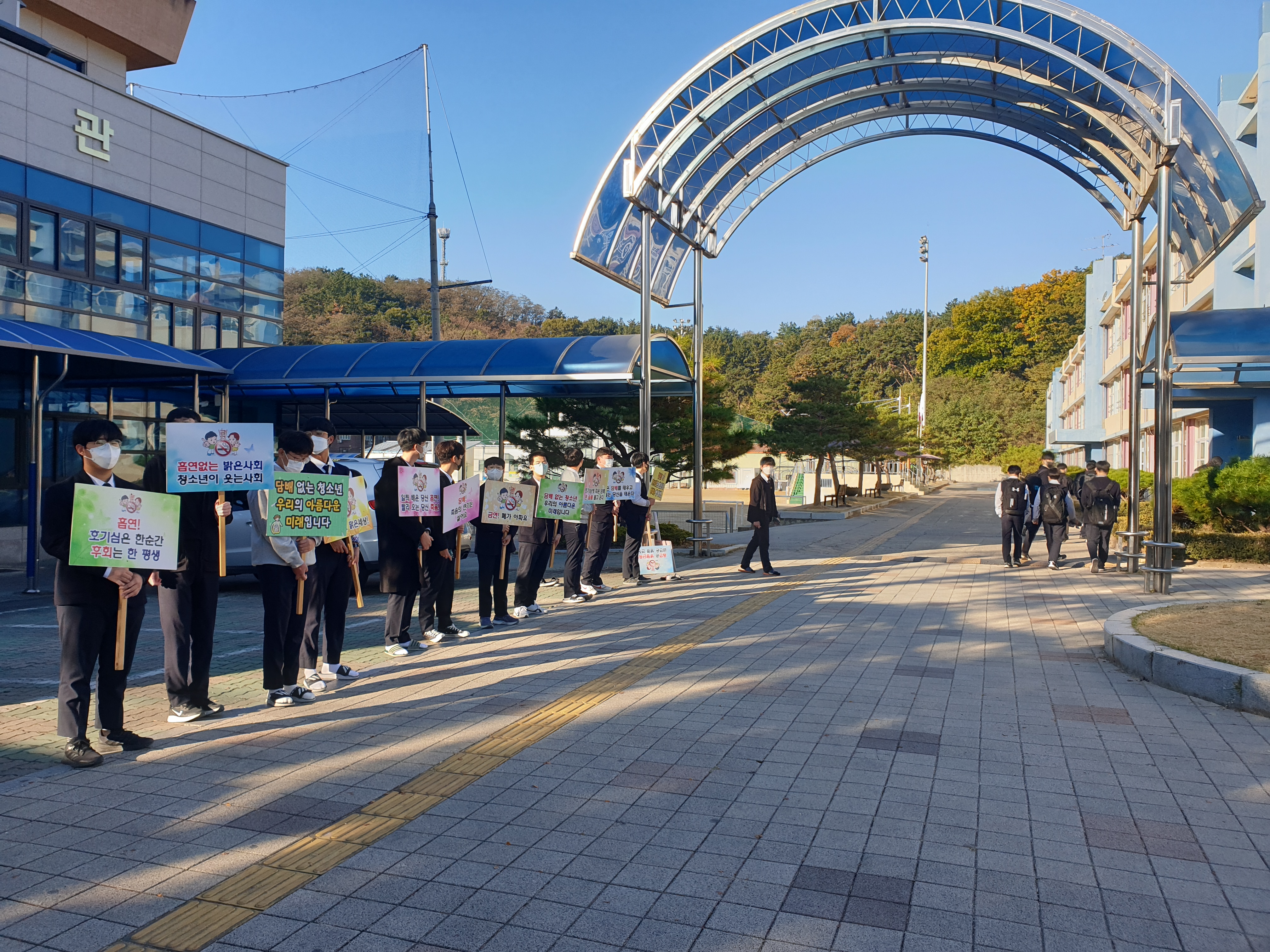 □ 10월 26일(수) 아침 등교시간 학교 정문에서 학생회 임원, 학급실장, 학생부 교사, 보건교사가 함께 피켓을 들고 금연 구호를 외치며 흡연예방 및 금연 캠페인을 실시하여 등교하는 학생 및 지역 주민들에게 흡연예방과 금연실천의 중요성을 알렸다.