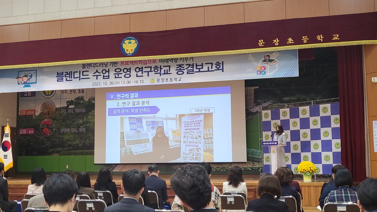 □ 문장초등학교(교장 이대영)는 2022년 10월 26일(수) ‘블렌디드 러닝 기반 프로젝트 학습으로 미래 역량 기르기’라는 주제로 연구학교 종결 보고회를 가졌다. 문장초등학교는 2021년 3월~2023년 2월까지 2년 동안 운영되는 블렌디드 수업 운영 연구학교로 이번 보고회에서는 2차년도 동안 운영하였던 성과들을 발표하였다.